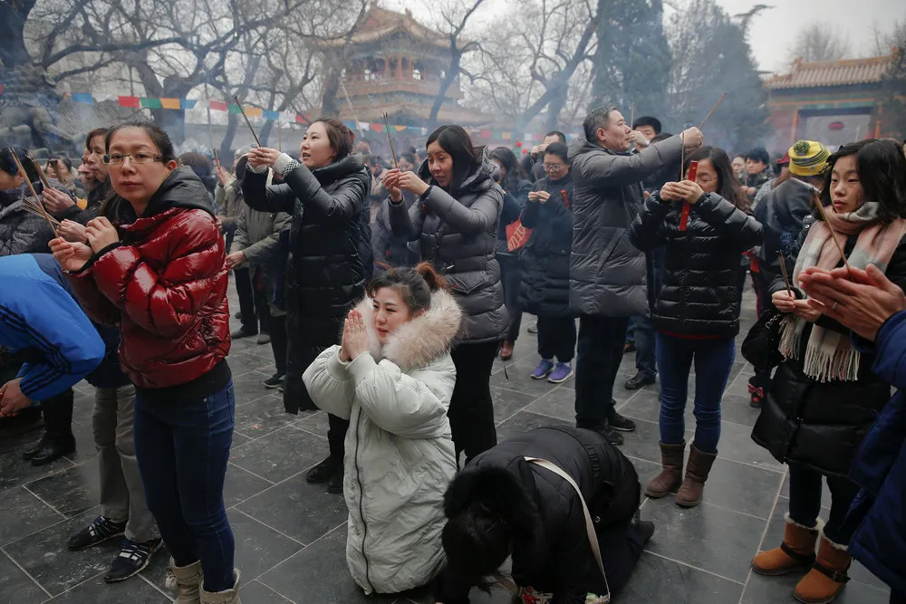 People burn incense sticks and pray for good fortune at Yonghegong Lama Temple on the first day of the Lunar New Year of the Rooster in Beijing, China January 28, 2017. (Photo by Damir Sagolj/Reuters)