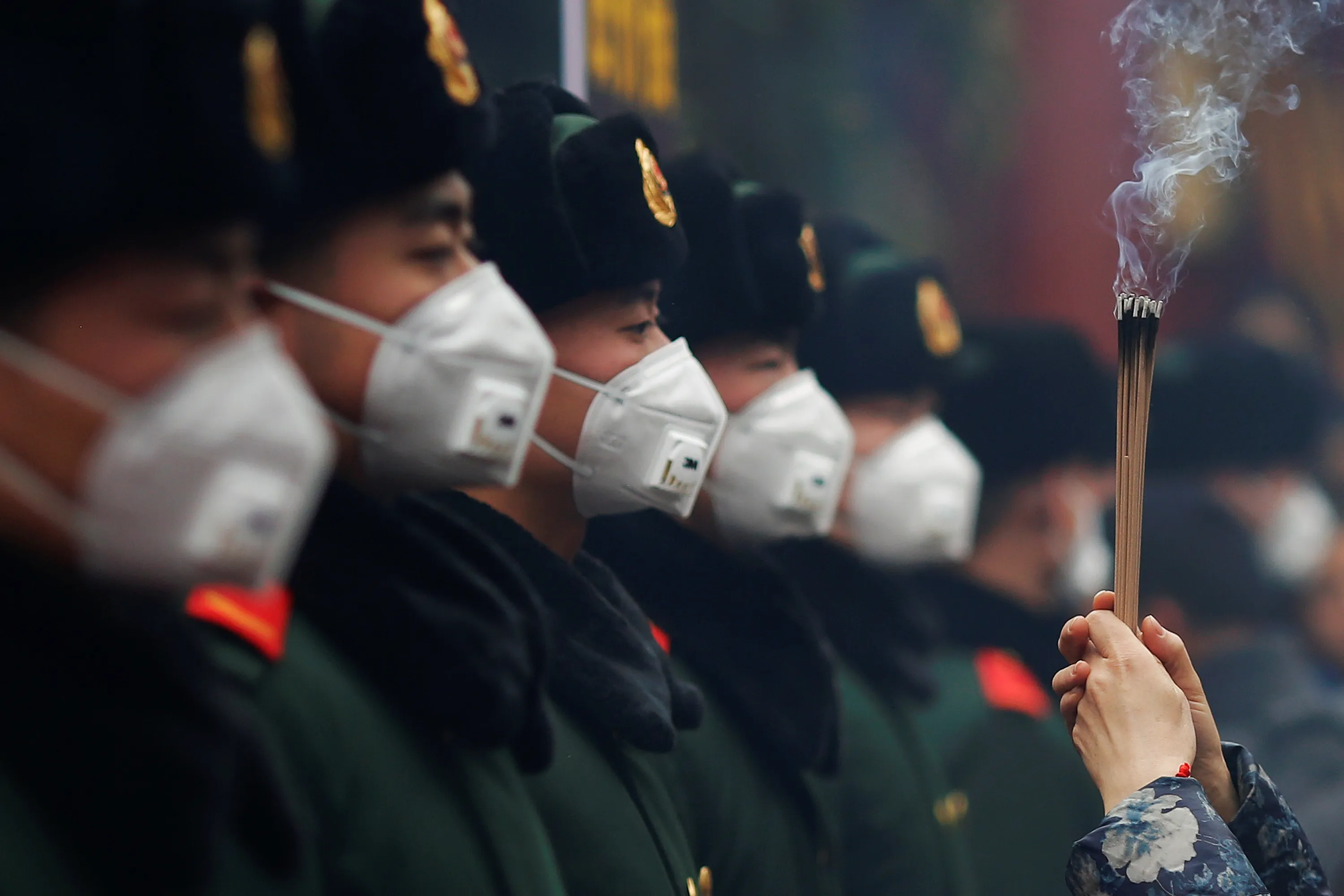 A woman holds incense sticks in front of paramilitary policemen providing security as people gather at Yonghegong Lama Temple to pray for good fortune on the first day of the Lunar New Year of the Rooster in Beijing, China January 28, 2017. (Photo by Damir Sagolj/Reuters)