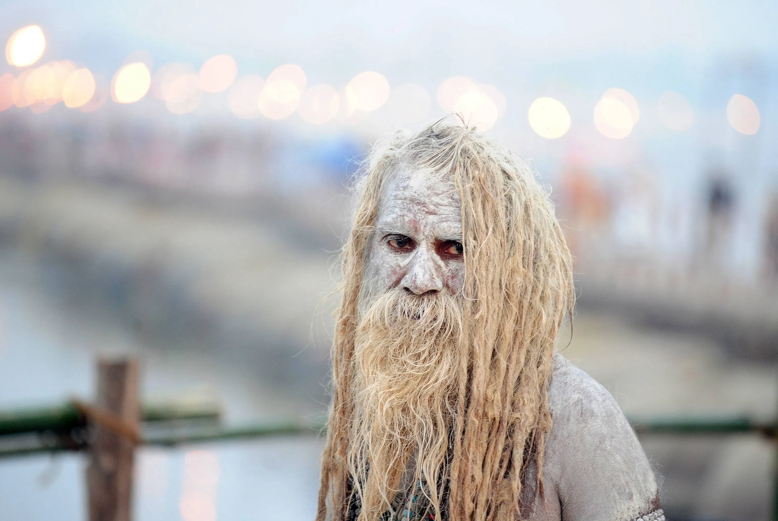 An Indian Sadhu (Hindu holy man) looks on after bathing in the River Ganges and smearing his body with ash, during the Magh Mela festival in Allahabad on January 22, 2017. The Magh Mela is held every year on the banks of Triveni Sangam – the confluence of the three great rivers Ganga, Yamuna and the mystical Saraswati – in Prayag near Allahabad during the Hindu month of Magh which corresponds to mid January-mid February. (Photo by Sanjay Kanojia/AFP Photo)