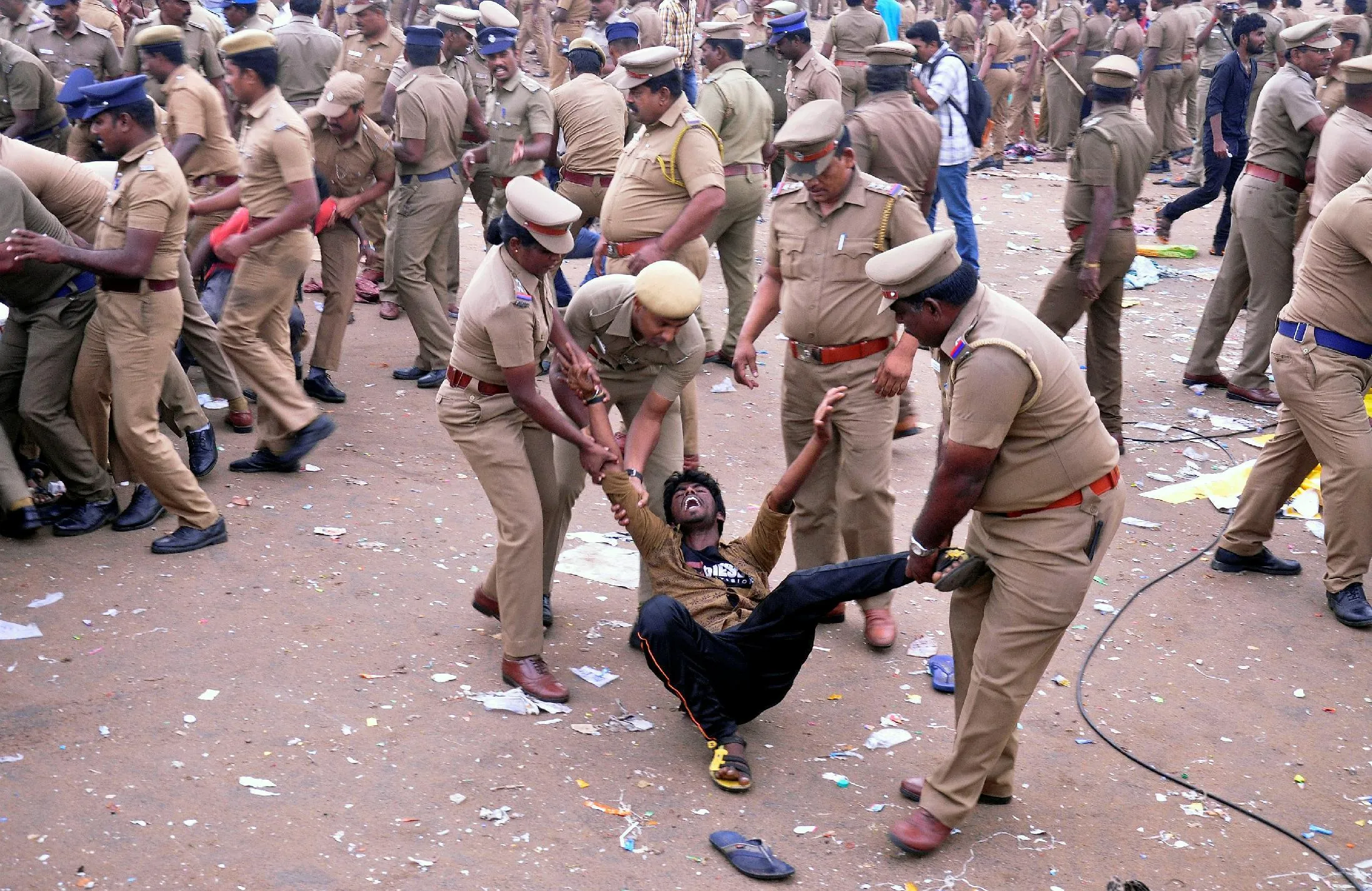 Police remove a demonstrator from Marina beach during a protest demanding a permanent solution to ensure the unhindered conduct of Jallikattu, a traditional bull-taming contest, in Chennai, India, January 23, 2017. (Photo by Reuters/Stringer)