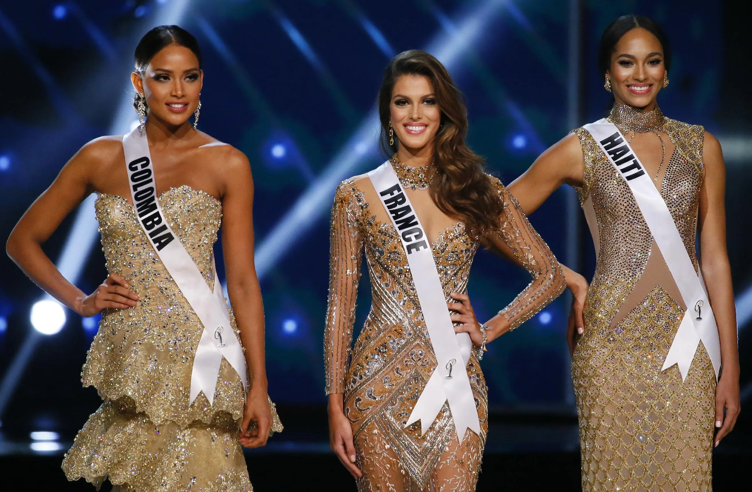 Andrea Tovar of Colombia, left, Iris Mittenaere of France, center, and Raquel Pelissier of Haiti, pose shortly after being declared the top three finalists in the Miss Universe 2016 coronation Monday, January 30, 2017, at the Mall of Asia in suburban Pasay city, south of Manila, Philippines. Iris Mittenaere was crowned the Miss Universe 2016 while Raquel Pelissier was the runner-up. (Photo by Bullit Marquez/AP Photo)