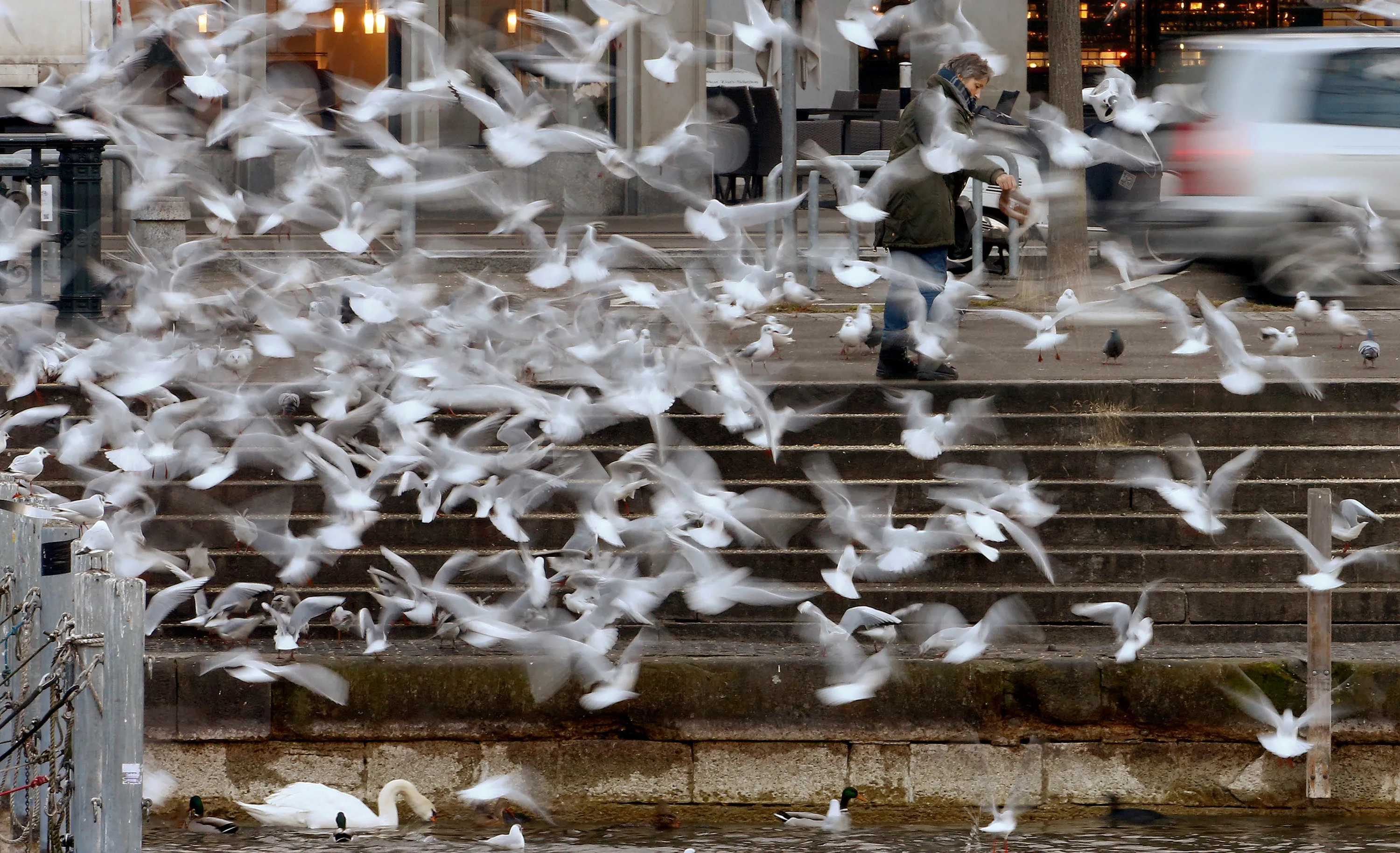 A woman feeds birds on the banks of the Limmat river in Zurich, Switzerland January 30, 2017. (Photo by Arnd Wiegmann/Reuters)