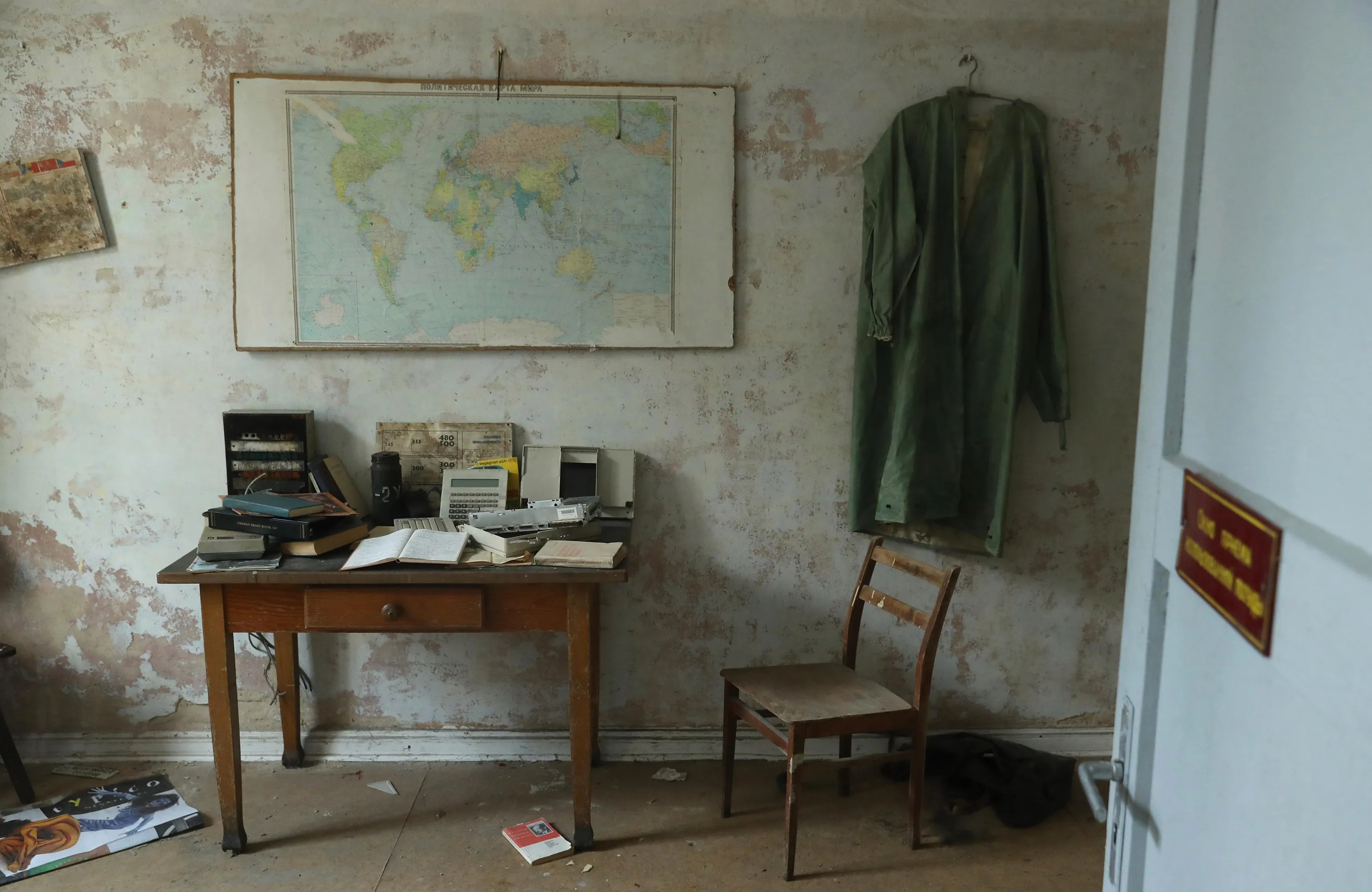 A map of the world in Russian hangs over a desk in the officers' building at the former Soviet military base on January 26, 2017 in Wuensdorf, Germany. (Photo by Sean Gallup/Getty Images)