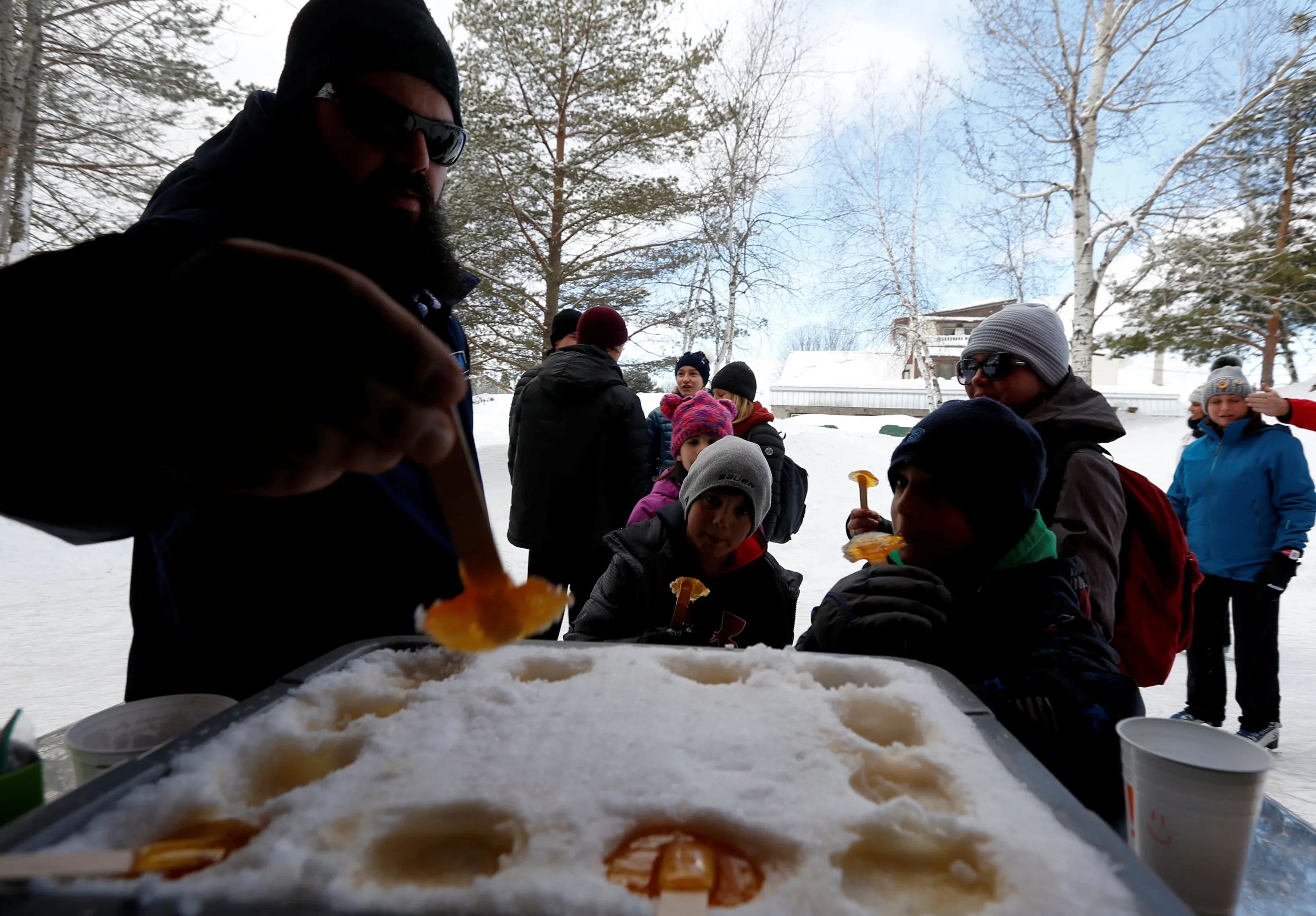 A family from Gatineau stop to taste maple taffy while skating at the Domaine de la Foret Perdu or the Lost Forest, a 15km weaving and zambonied forest trail made for skating in Notre-Dame-du-Mont-Carmel, near Three Rivers, Quebec January 29, 2017. (Photo by Christinne Muschi/Reuters)