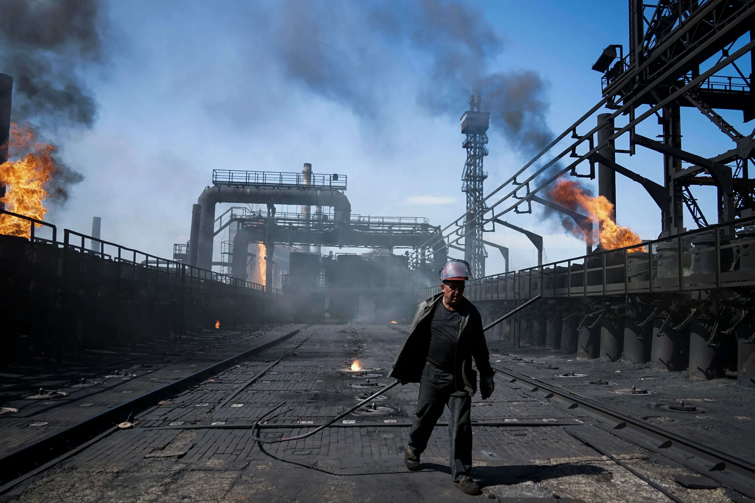 In this Tuesday, August 4, 2015 file photo a worker carries a metal rod at the front-line Avdiivka coking plant in eastern Ukraine. Fighting between government troops and separatist rebels in eastern Ukraine escalated on Tuesday, January 31, 2017, killing several people overnight, injuring many more and trapping 200 coalminers underground, the warring sides reported. (Photo by Mstyslav Chernov/AP Photo)