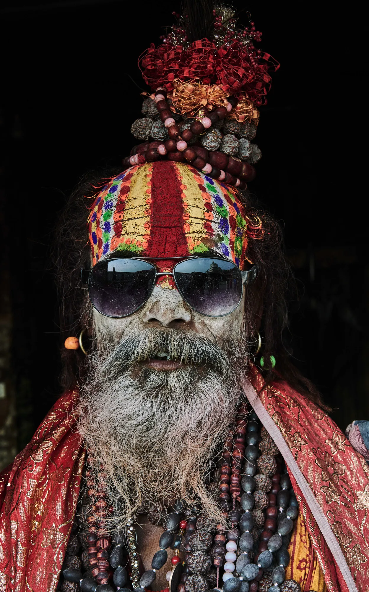A holy man with a decorative face and headdress wearing sunglasses, taken in Kathmandu, Nepal. (Photo by Jan Moeller Hansen/Barcroft Images)