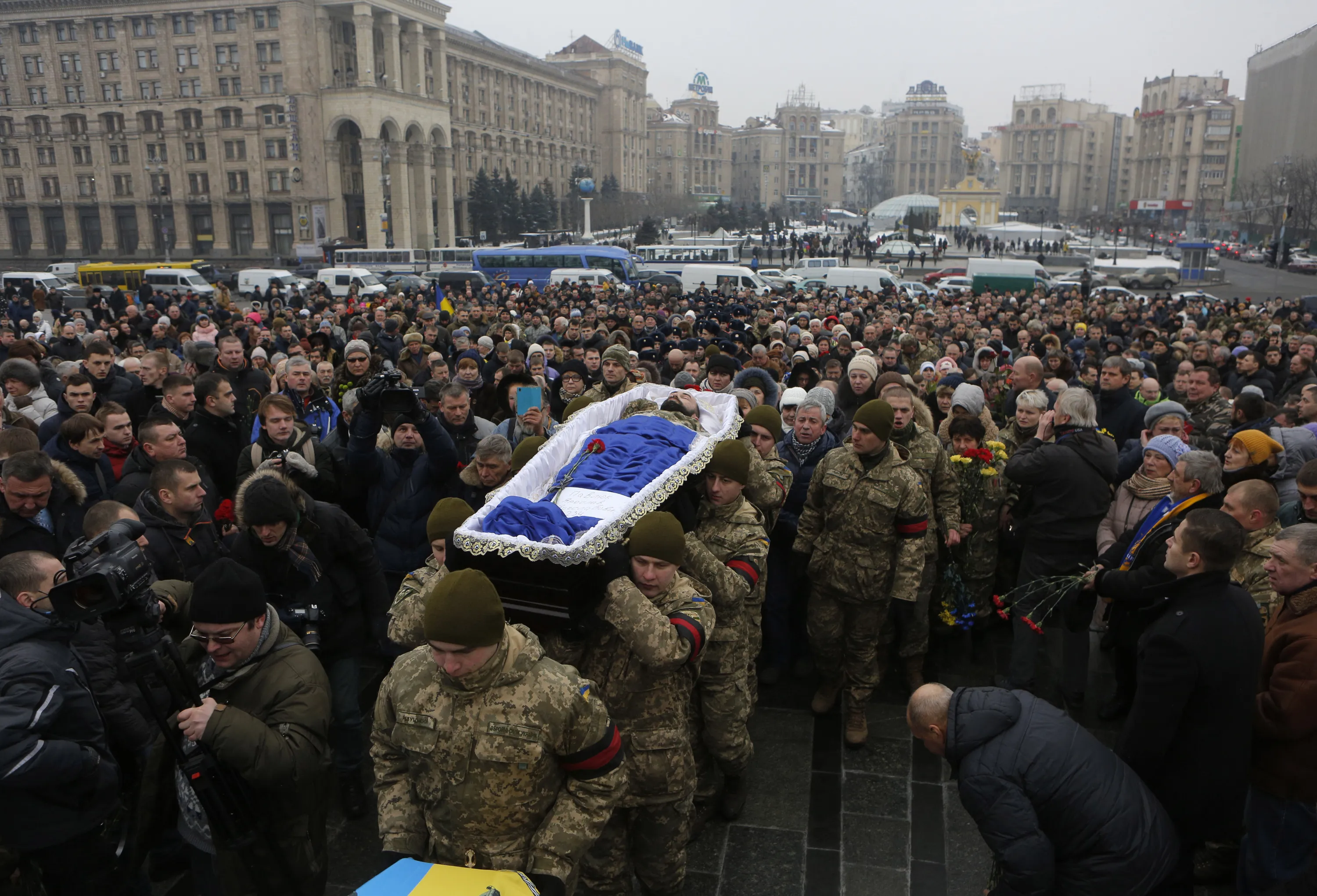 Ukrainian soldiers carry the coffin of Ukrainian servicemen killed in eastern Ukraine, in Independence Square in Central Kiev, Ukraine, Wednesday, February 1, 2017. Recent fighting is concentrated around the suburb of Avdiivka on the northern outskirts of the separatist stronghold of Donetsk where residents have been without electricity for some days. (Photo y Sergei Chuzavkov/AP Photo)