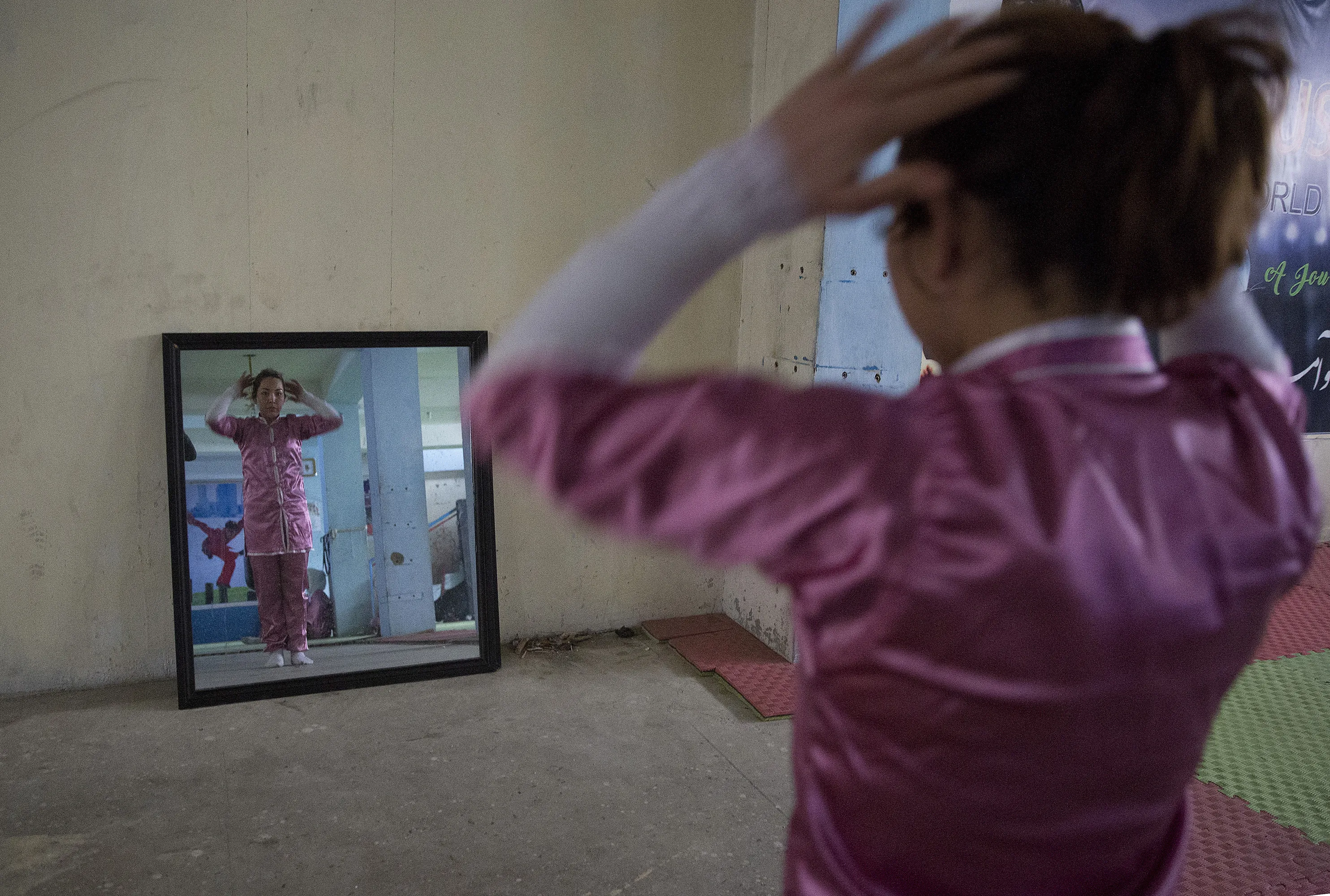 A Shaolin martial arts student prepares to practice at her club in Kabul, Afghanistan, Tuesday, January 25, 2017. At first the women could not find Shaolin uniforms, but, undeterred, they designed and ordered uniforms made by a Kabul tailor. (Photo by Massoud Hossaini/AP Photos)