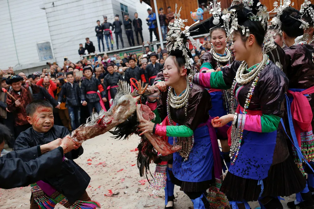 An ethnic “Kam” (also known as Dong) boy pulls the head of a live duck during a traditional wedding ritual “steal the chicken at the drum tower” in a minority Dong village in southwestern Chinese city of Congjiang, Guizhou province, China January 29, 2017. (Photo by Tyrone Siu/Reuters)
