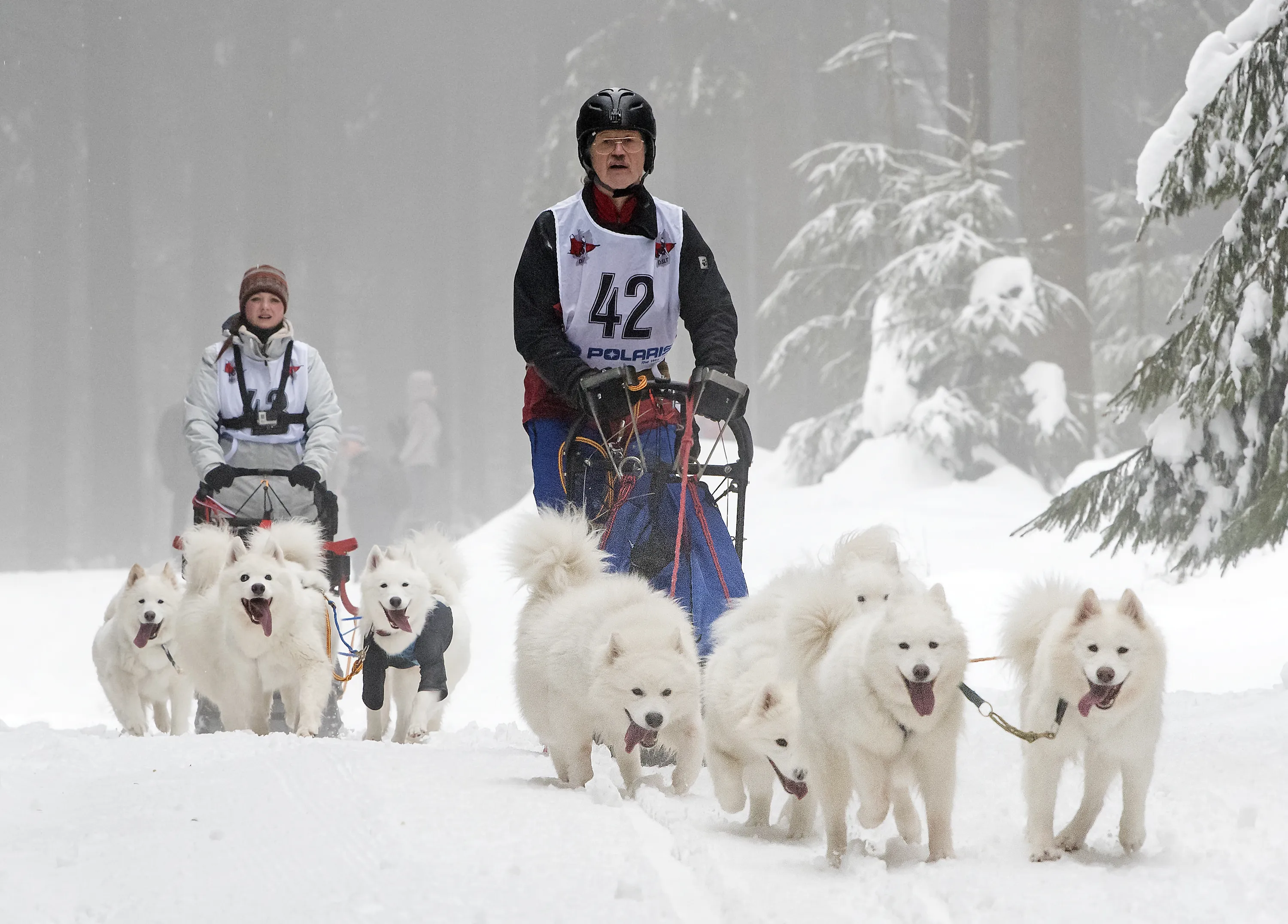 Harry Weiss of Germany, front, competes with his dog-sled during Trans-Thuringia 2017, a t dog-sled race with purebred dogs near Masserberg, central Germany, Thursday, February 2, 2017. (Photo by Jens Meyer/AP Photo)