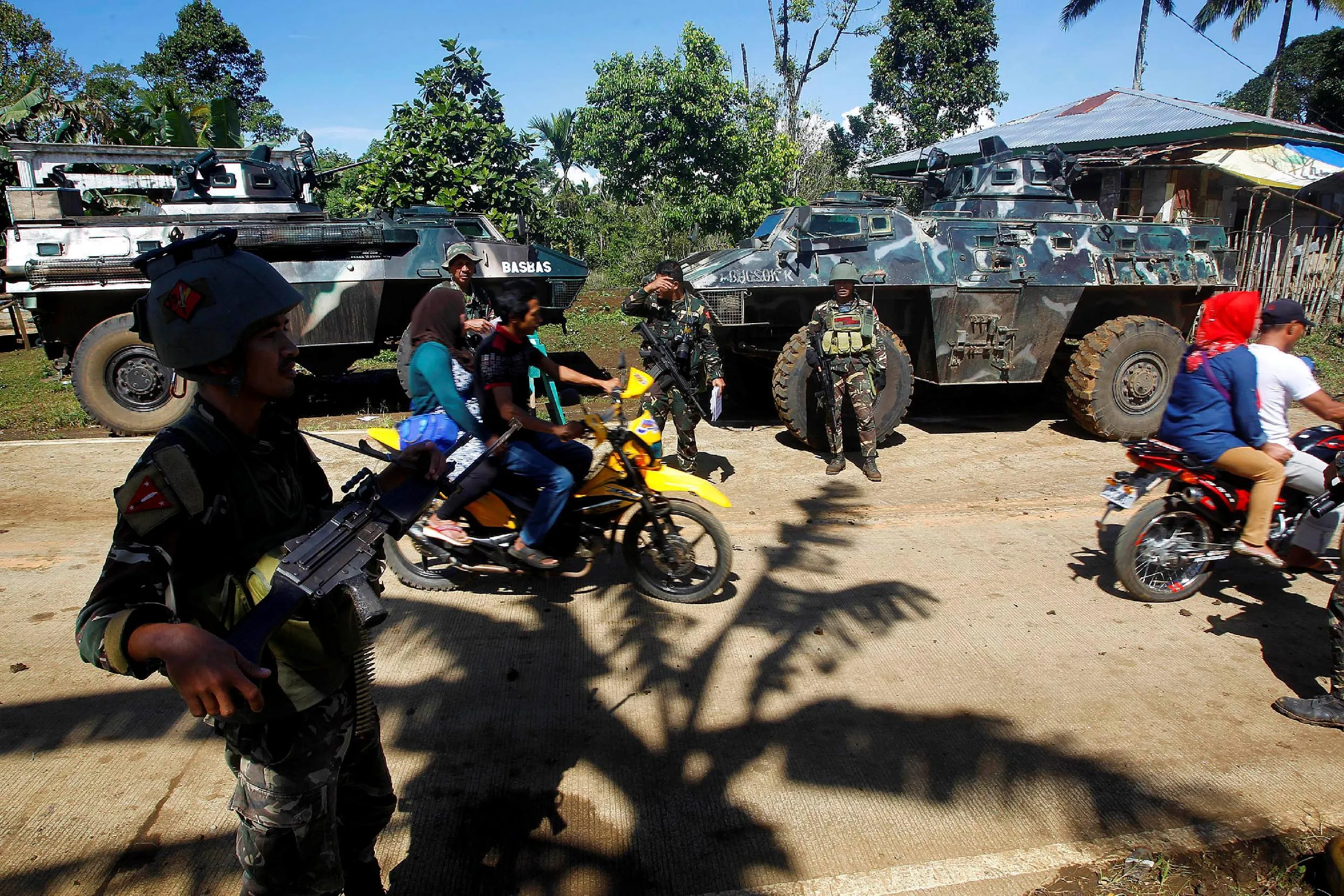 Motorists and commuters drive past soldiers at a checkpoint in Butig, Lanao del Sur in southern Philippines February 1, 2017. (Photo by Marconi B. Navales/Reuters)