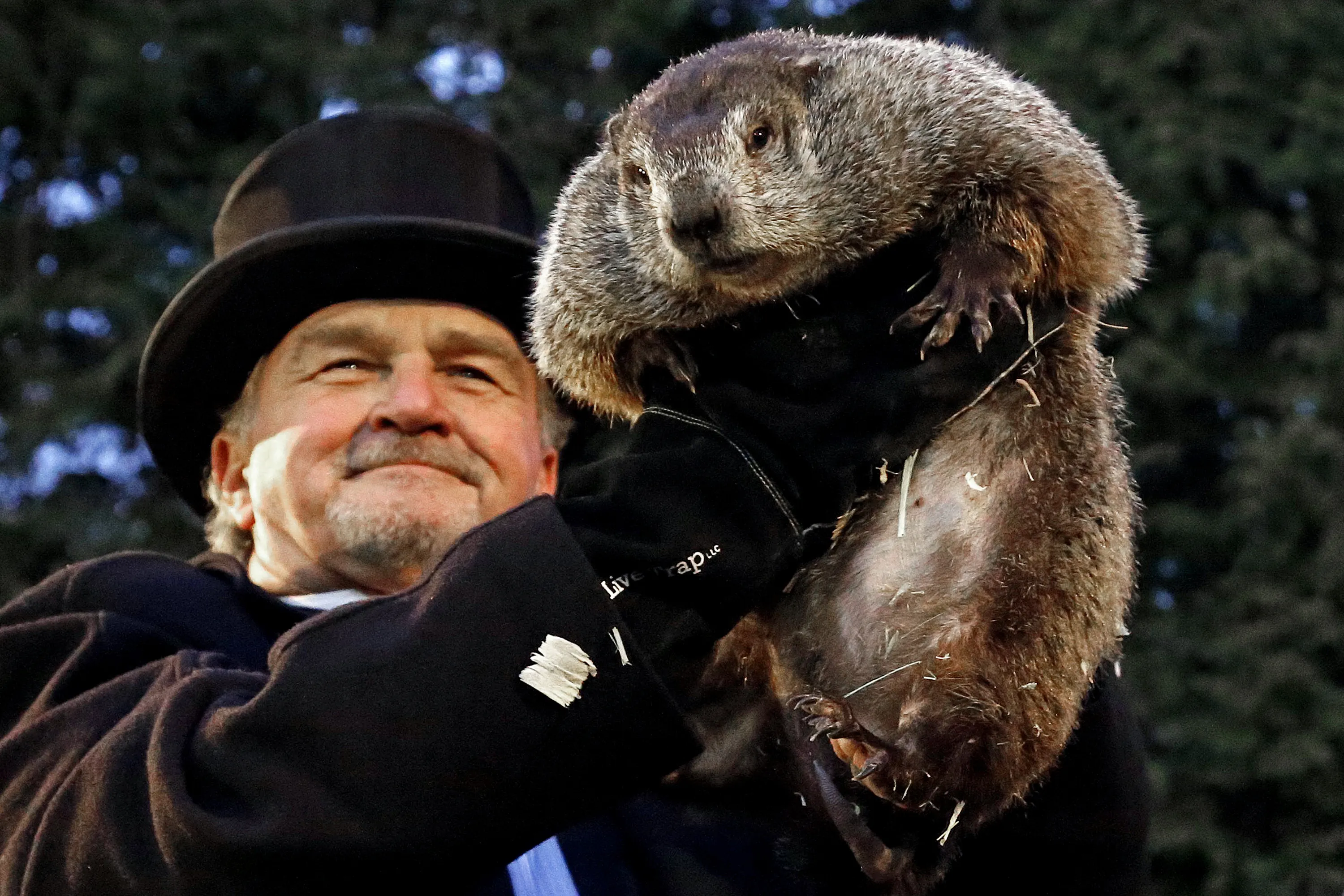 Groundhog Club handler John Griffiths holds Punxsutawney Phil, the weather prognosticating groundhog, during the 131st celebration of Groundhog Day on Gobbler's Knob in Punxsutawney, Pa. Thursday, February 2, 2017. Phil's handlers said that the groundhog has forecast six more weeks of winter weather. (Photo by Gene J. Puskar/AP Photo)