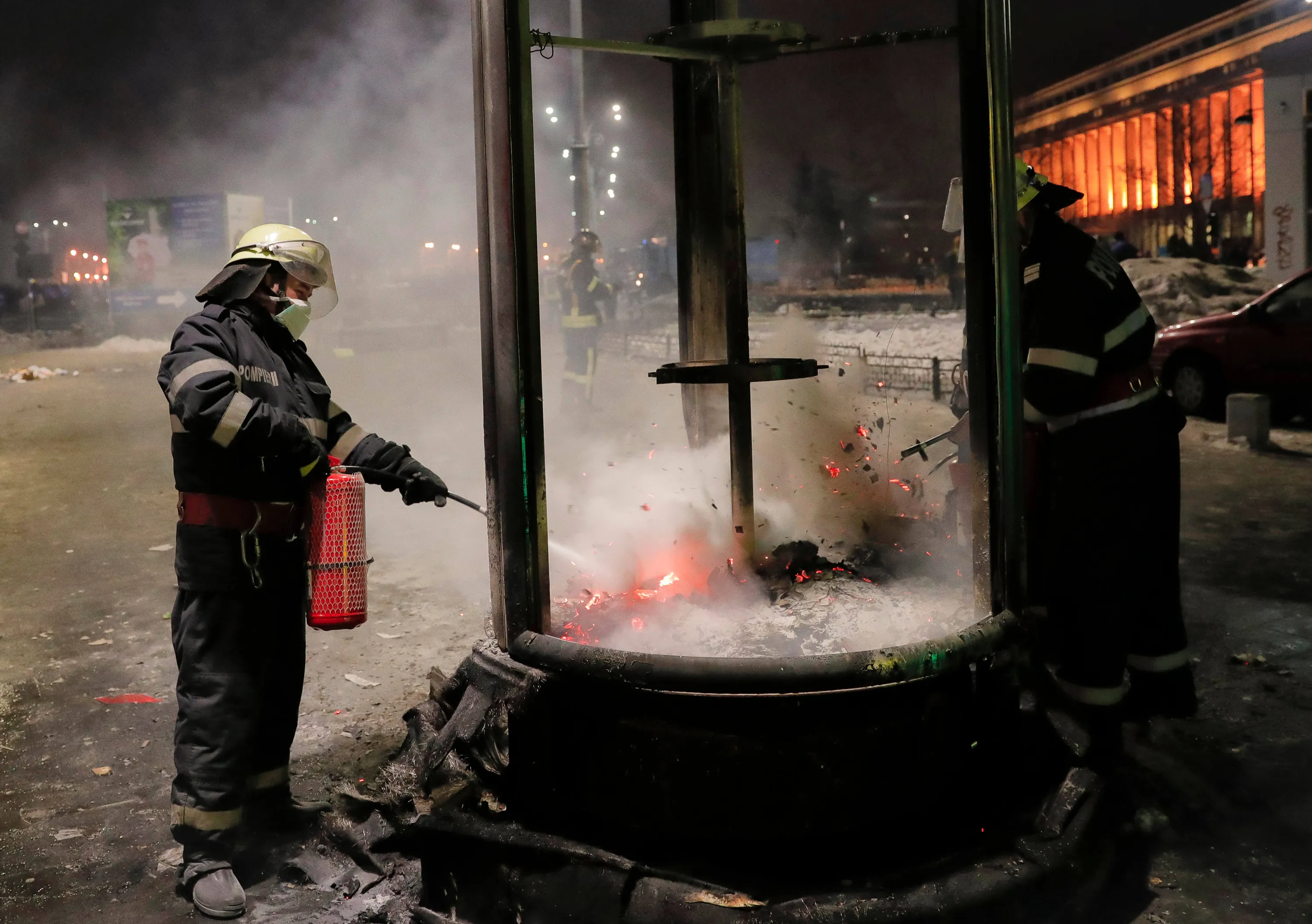 Firefighters put out a burning kiosk after minor clashes erupted during a protest in Bucharest, Romania, Thursday, February 2, 2017. (Photo by Vadim Ghirda/AP Photo)