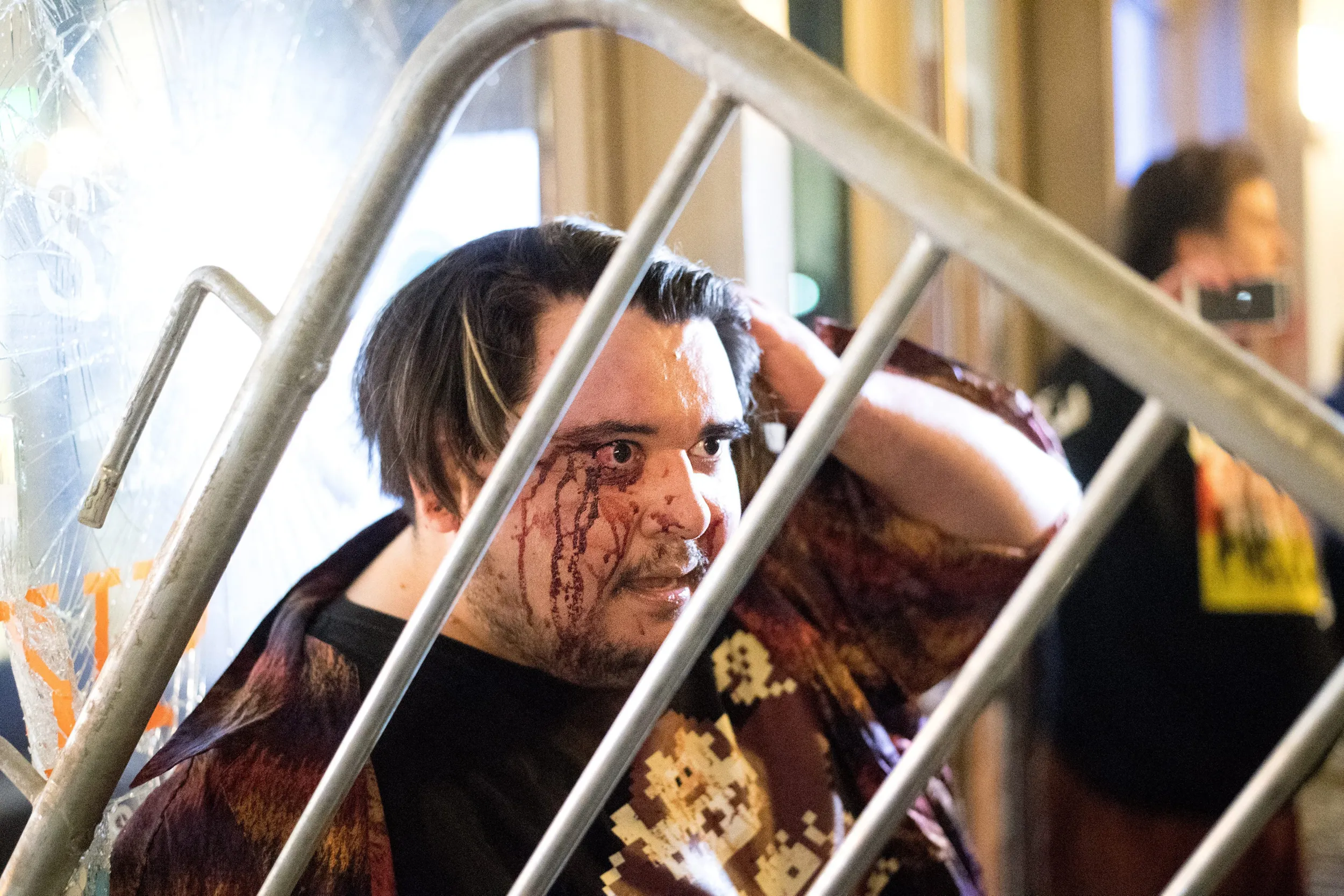 Eddy Brock, who says he is a free speech advocate who was attacked by demonstrators protesting against Breitbart News editor Milo Yiannopoulos, holds his head in Berkeley, California, USA, 01 February 2017. (Photo by Noah Berger/EPA)
