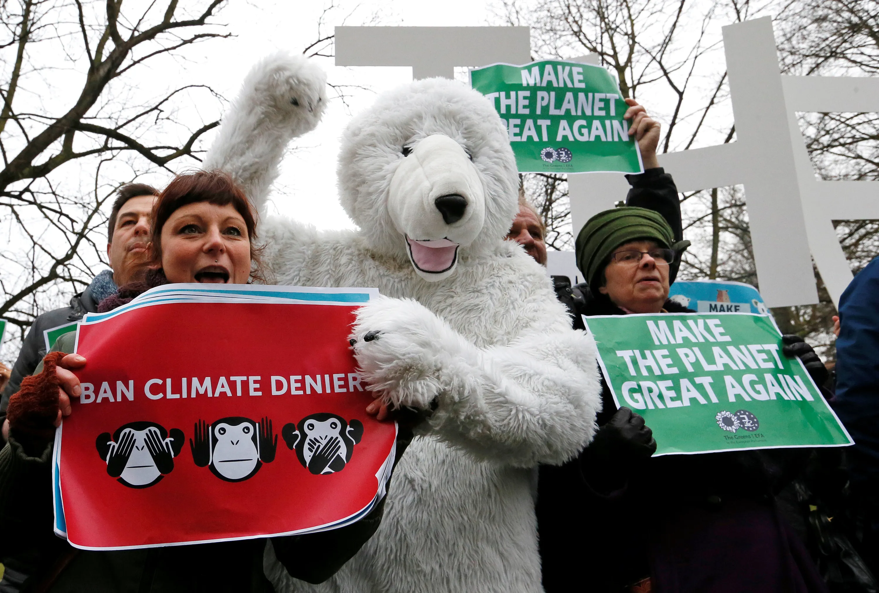 Environmental activists take part in a protest while Myron Ebell, who leads U.S. President Donald Trump's Environmental Protection Agency's transition team, arrives at the Solvay library in Brussels, Belgium to address a meeting, February 1, 2017. (Photo by Yves Herman/Reuters)