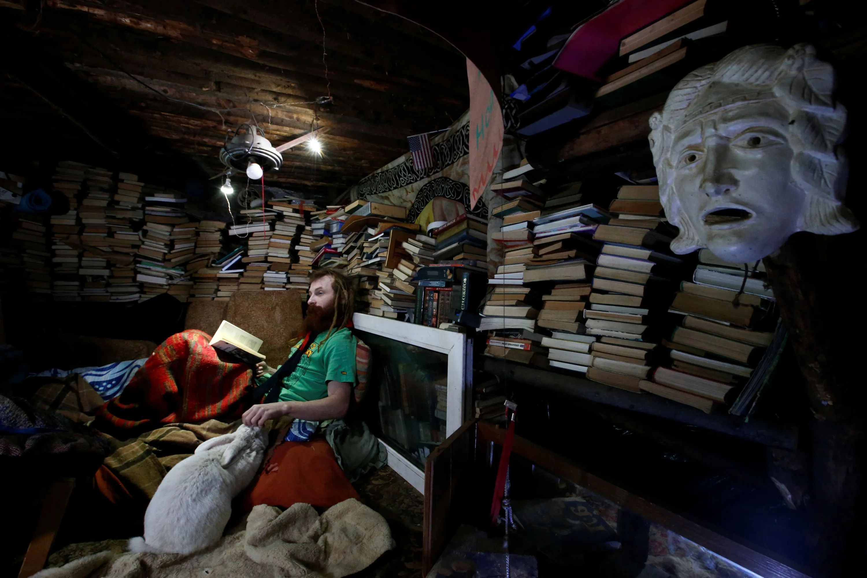 Yury Alekseyev, a former lawyer from Moscow who is called a “Russian hobbit”, pats a rabbit named Petrushka at his underground home in the forest on the side of the road northeast from Moscow, Russia February 3, 2017. (Photo by Sergei Karpukhin/Reuters)