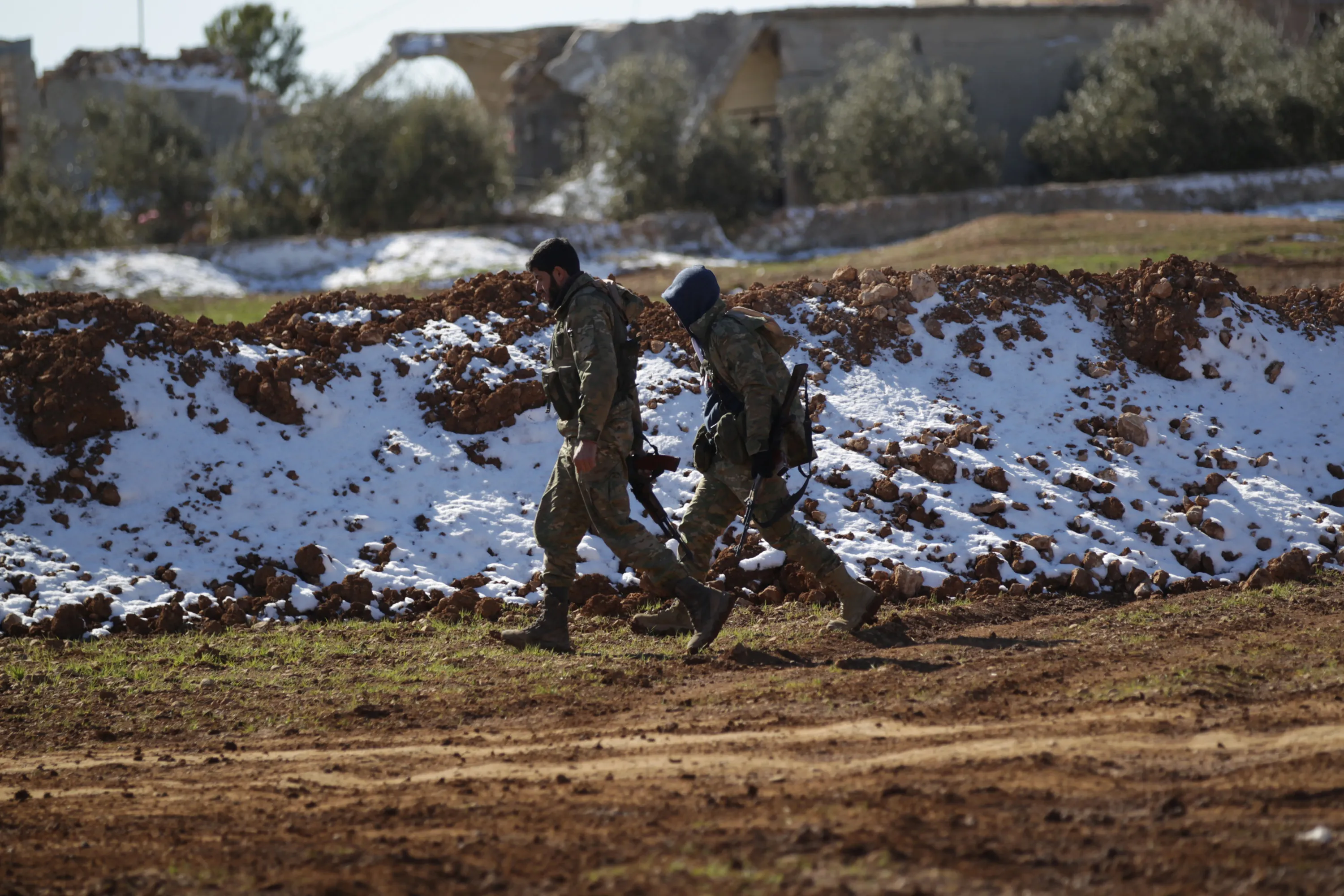 Rebels walk near snow on the outskirts of the northern Syrian town of al-Bab, Syria January 29, 2017. (Photo by Khalil Ashawi/Reuters)