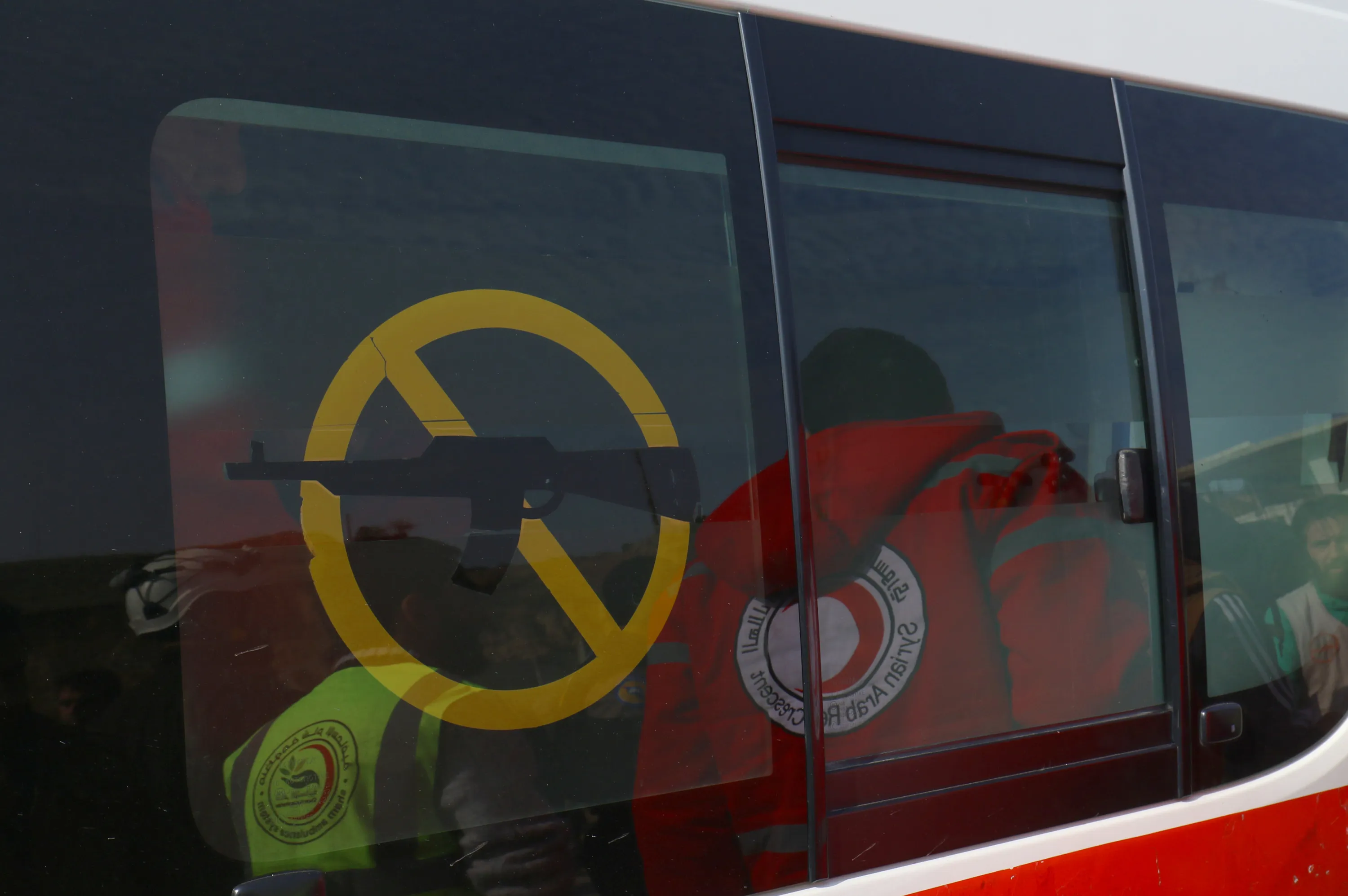 A red crescent member stands near a no-arms sign as people evacuated from the Wadi Barada valley near Damascus, after an agreement reached on Thursday between rebels and Syria's army, arrive in the rebel controlled Qalaat al-Madiq town in Hama province, Syria January 30, 2017. (Photo by Omar Sanadiki/Reuters)