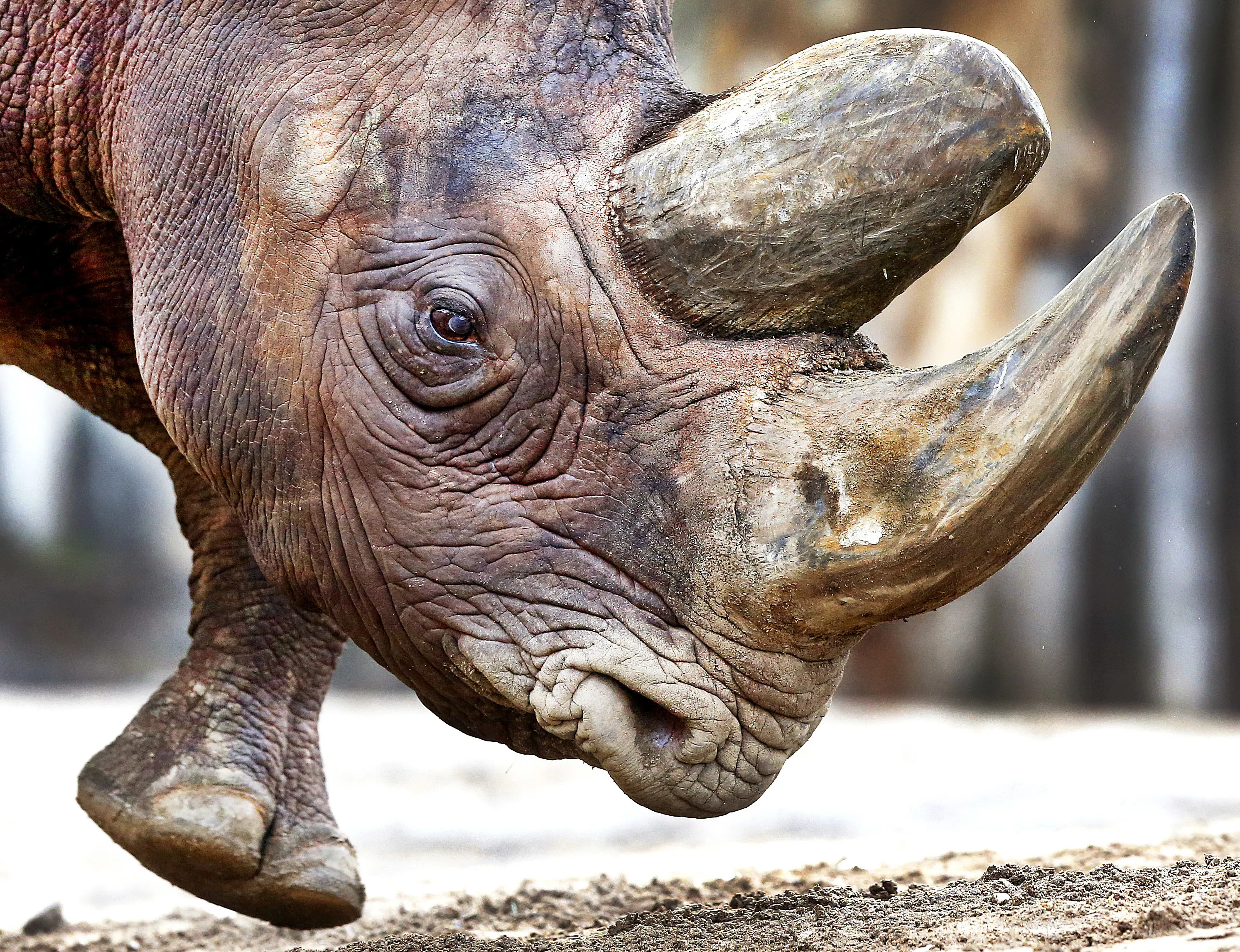 Black rhinoceros Kalusho that was born 30 years ago in Zimbabwe walks in its enclosure in the zoo in Frankfurt, Germany, Friday, February 3, 2017. Kalusho came to Frankfurt when it was three years old. (Photo by Michael Probst/AP Photo)