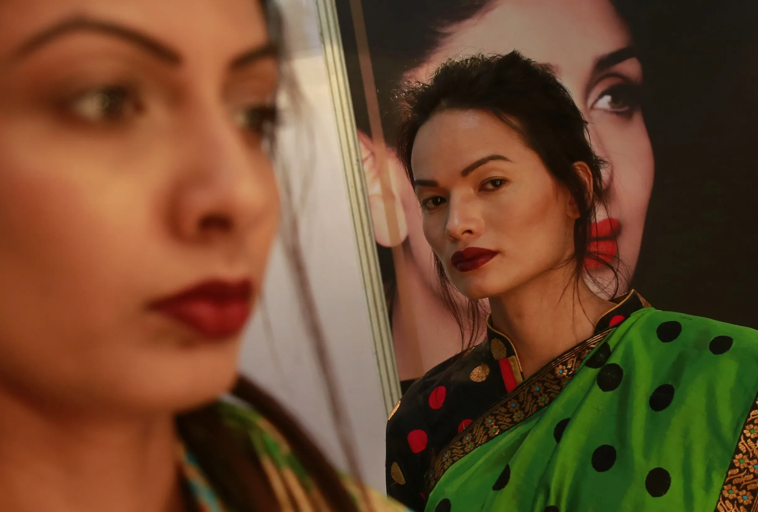 In this February 2, 2017 photo, Anjali Lama, a transgender model from Nepal, stands backstage at the Lakme Fashion week in Mumbai, India. Growing up as the fifth son in a poor farming family in rural Nepal the dream to be a fashion model came late in life. First came a long, painful struggle to accept that he felt deeply female. It was a chance encounter with a group of transgender women that turned Lama's life around by putting her in touch with the Blue Diamond Society, an advocacy group for Nepal's LGBT community. In 2005 she came out to her friends and family as a transgender woman. (Photo by Rafiq Maqbool/AP Photo)