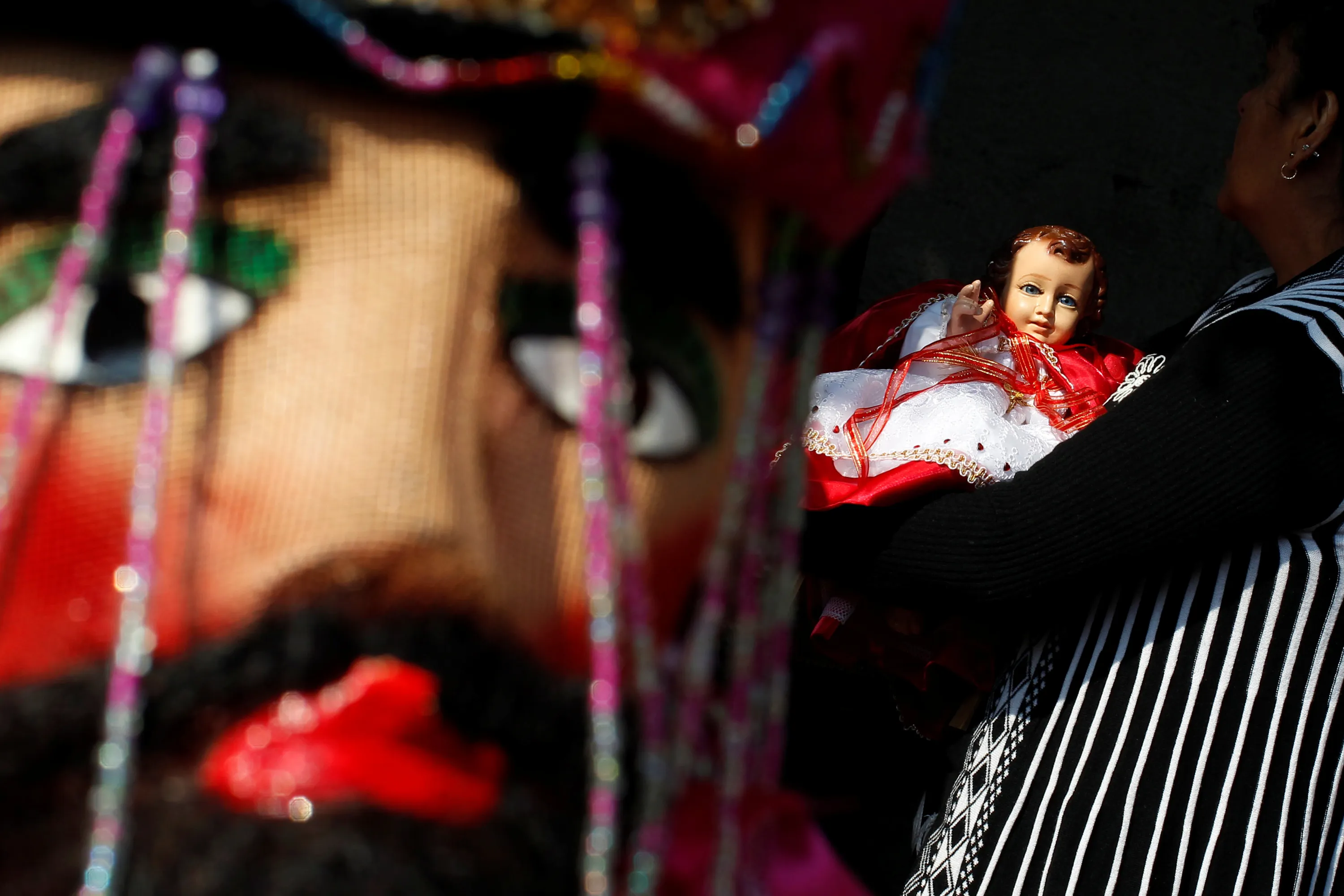A woman carries a dressed-up doll representing baby Jesus during the annual Feast of Candelaria celebration, where elaborate effigies of young Jesus are carried to be blessed 40 days after his birth, in Xochimilco neighborhood in Mexico City, Mexico, February 2, 2017. (Photo by Carlos Jasso/Reuters)