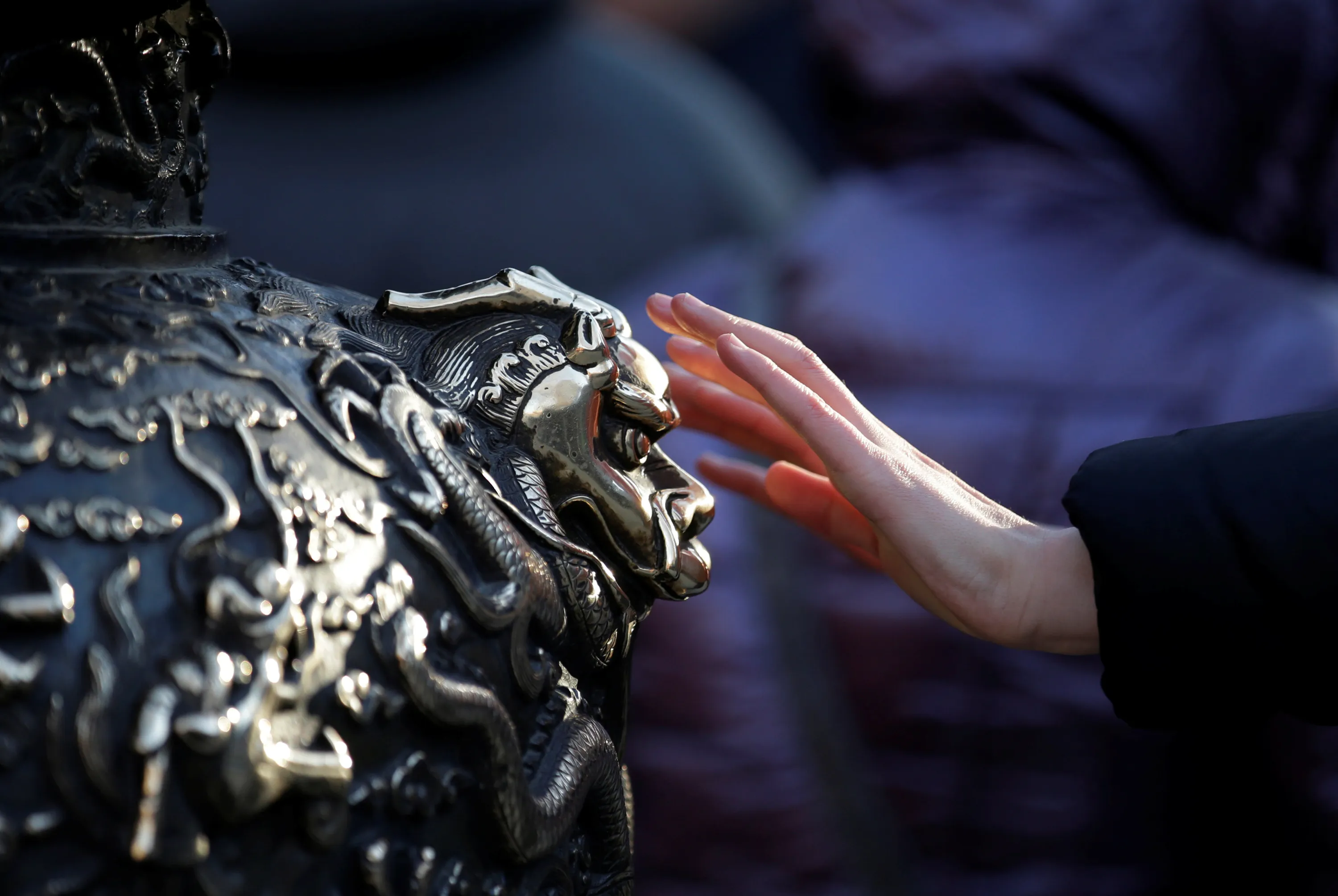 A woman touches a statue of a dragon for good fortune on the fifth day of the Chinese Lunar New Year at Baiyun Temple in Beijing, China, February 1, 2017. (Photo by Jason Lee/Reuters)