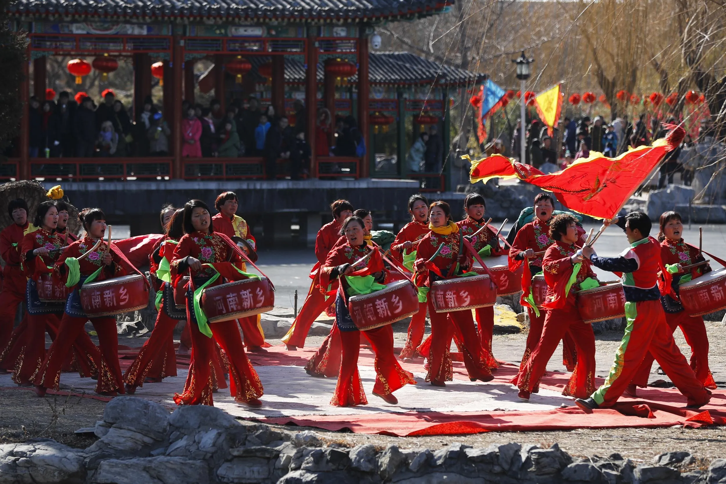 Chinese performers dressed in traditional costumes participate in a cultural dance at the Daguanyuan's temple fair for Lunar New Year celebrations in Beijing, Wednesday, February 1, 2017. Residents are enjoying a week long holiday for the Chinese New Year and visiting various temple fairs and carnivals around the Chinese capital. (Photo by Andy Wong/AP Photo)