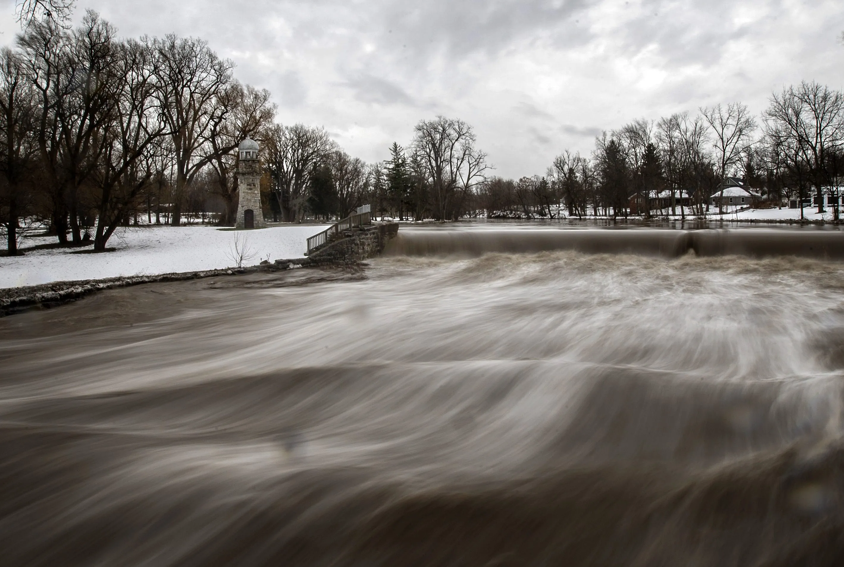 Cayuga Creek water rushes past a neighbourhood following a massive snow storm in Lancaster, New York November 24, 2014. Emergency workers filled thousands of sandbags on Sunday as the area around Buffalo, New York braced for potential flooding as warming temperatures began to melt up to seven feet (2 metres) of snow. (Photo by Mark Blinch/Reuters)