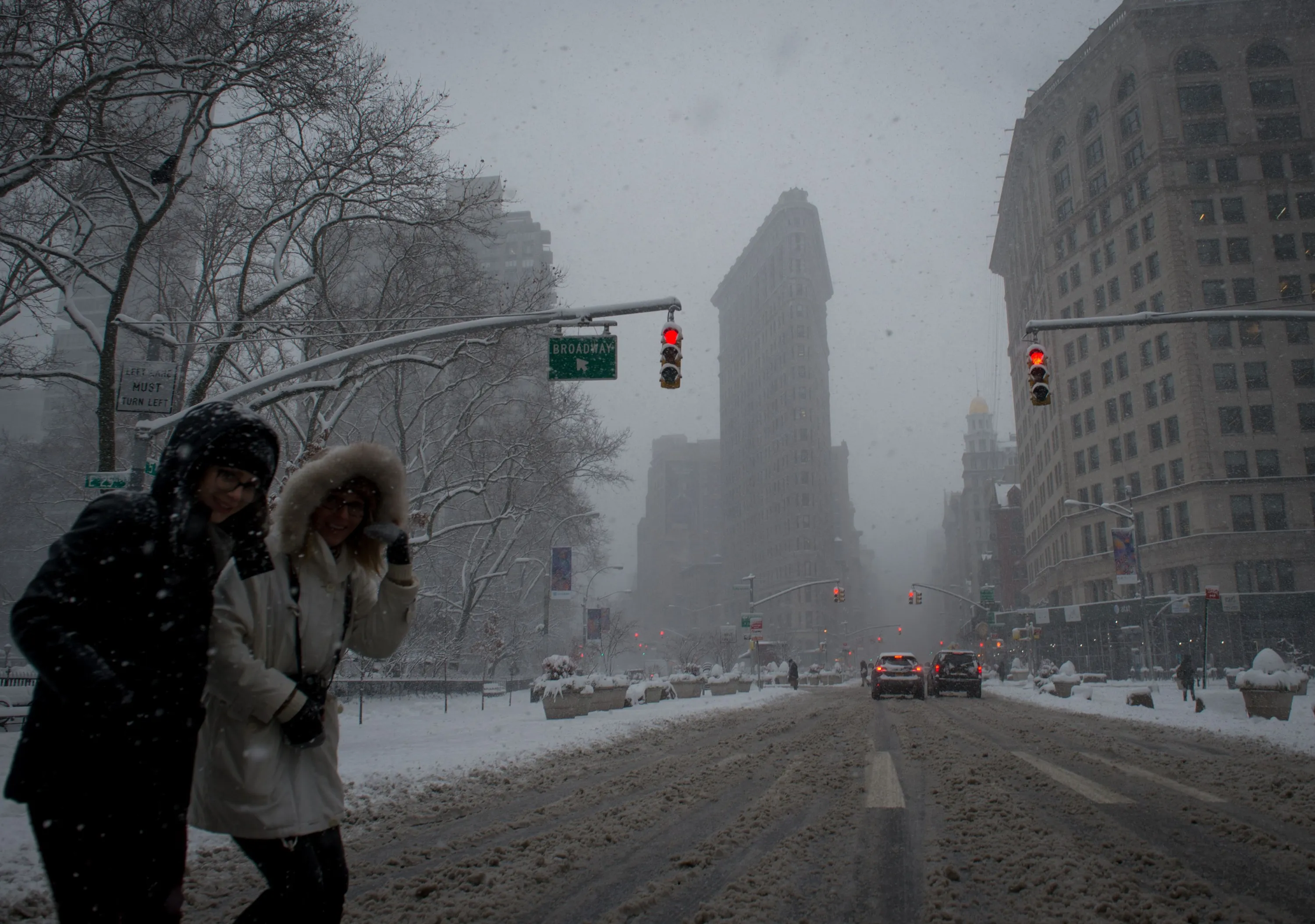 People walk past the Flatiron Building during a winter storm, February 9, 2017 in New York. (Photo by Bryan R. Smith/AFP Photo)