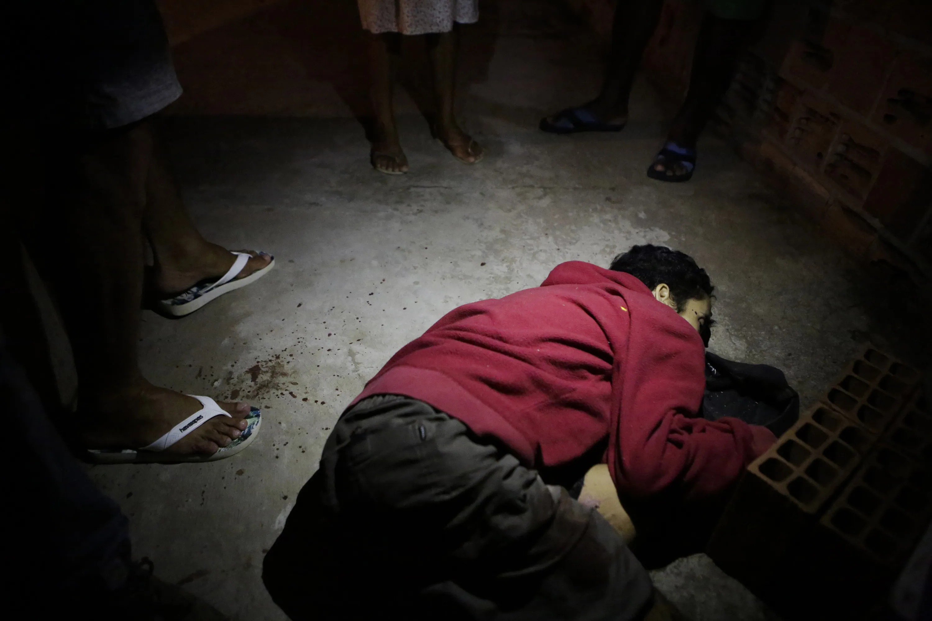 Nelson Eduardo Conclaves lies in a pool of blood as a neighbor stands over him in Vitoria, Espirito Santo state, Brazil, Thursday, February 9, 2017. According to his mother Erlita Pereira Goncalves, her 30-year-old son was shot dead by attackers who broke into their home and killed him in front of her. (Photo by Diego Herculano/AP Photo)