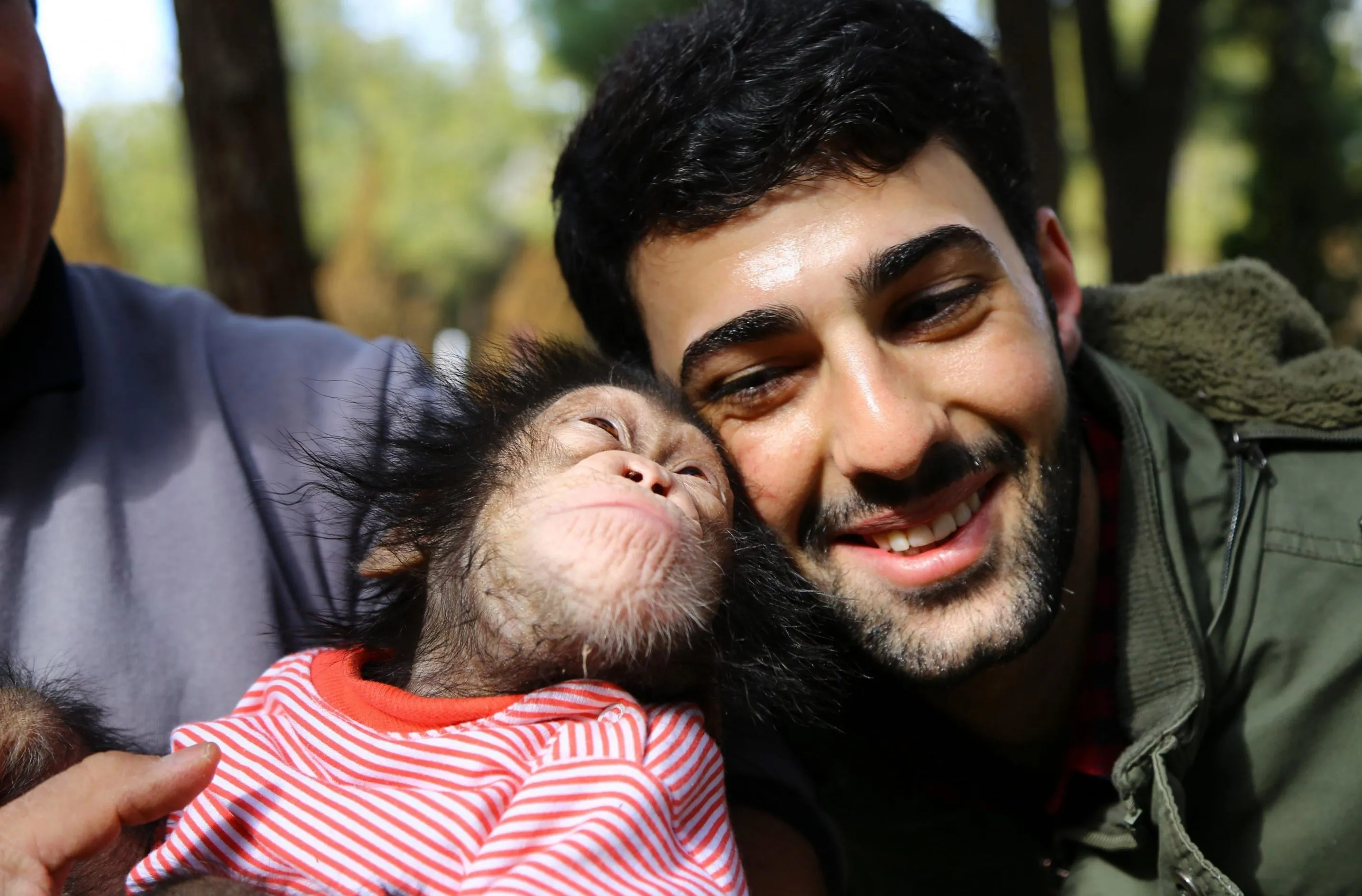 A man poses with the newborn baby chimpanzee named “Can”, as its mom refused to have him at Gaziantep Zoo, in Gaziantep, Turkey on February 10, 2017. (Photo by Adsiz Gunebakan/Anadolu Agency/Getty Images)