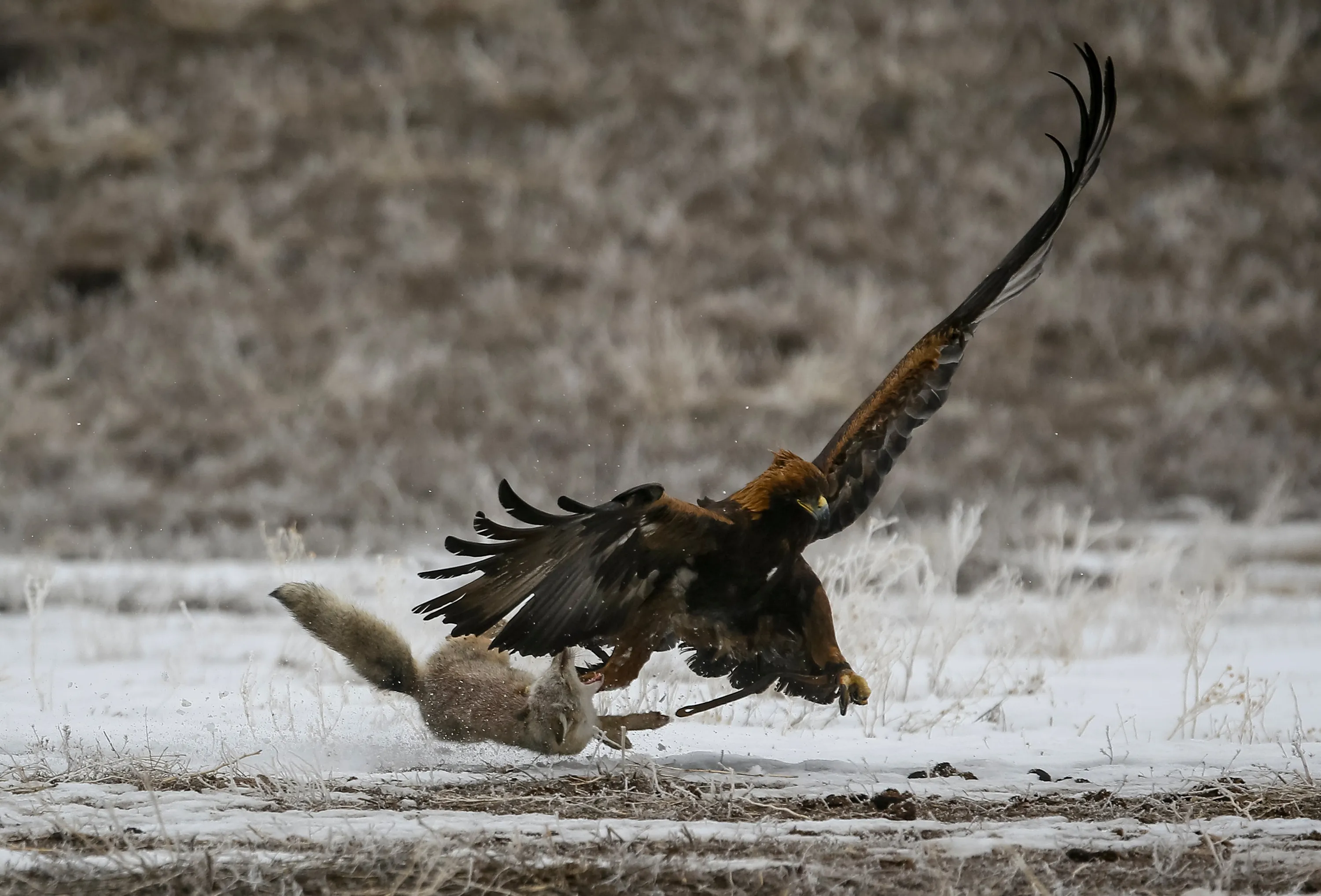 A tamed golden eagle attacks a corsac fox during an annual hunting contest in Chengelsy Gorge east of Almaty, Kazakhstan February 11, 2017. (Photo by Shamil Zhumatov/Reuters)