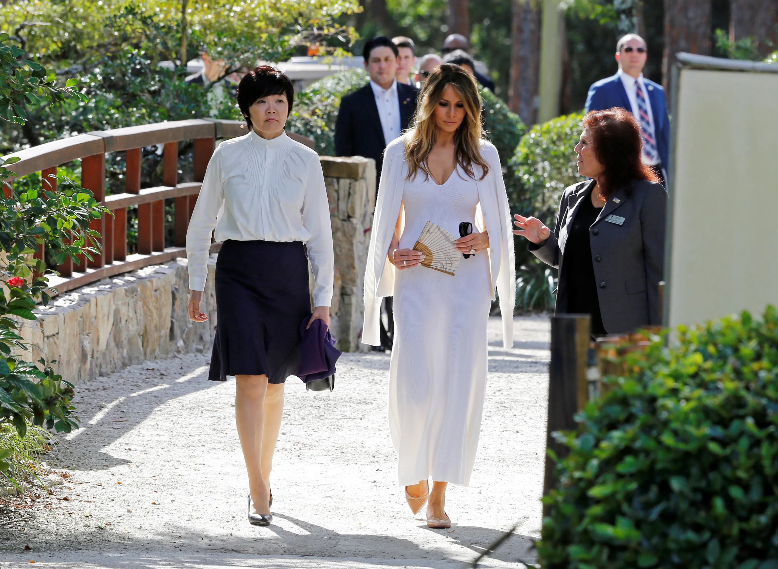 U.S. First Lady Melania Trump (C) and Akie Abe (L), wife of Japanese Prime Minister Shinzo Abe, listen to Park Administrator Bonnie White Lemay, as they tour Morikami Museum and Japanese Gardens in Delray Beach, Florida, U.S., February 11, 2017. (Photo by Joe Skipper/Reuters)