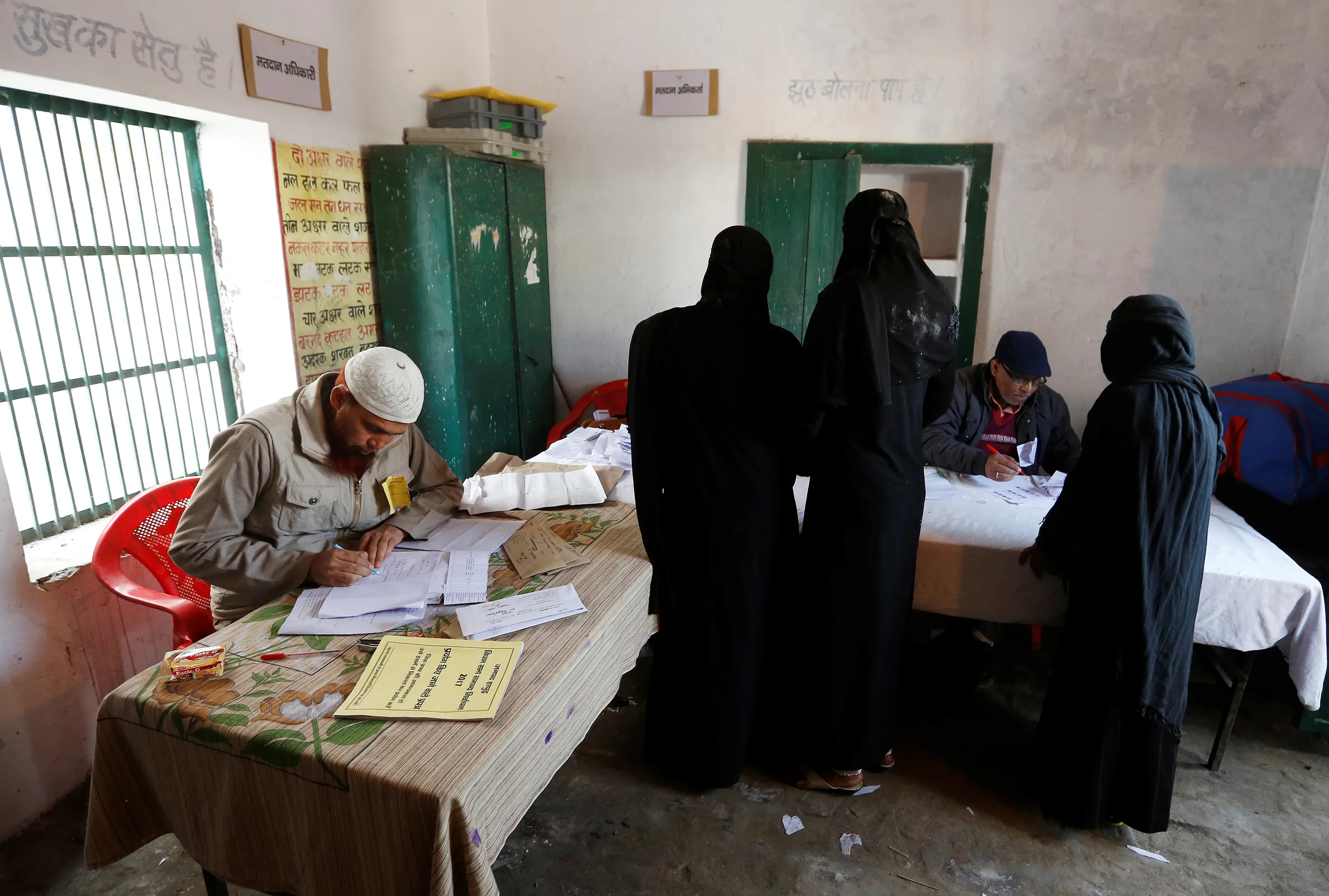 Veiled women wait to get their voting slip from an officer at a polling station during the state assembly election in Hapur, in the central state of Uttar Pradesh, India, February 11, 2017. (Photo by Adnan Abidi/Reuters)