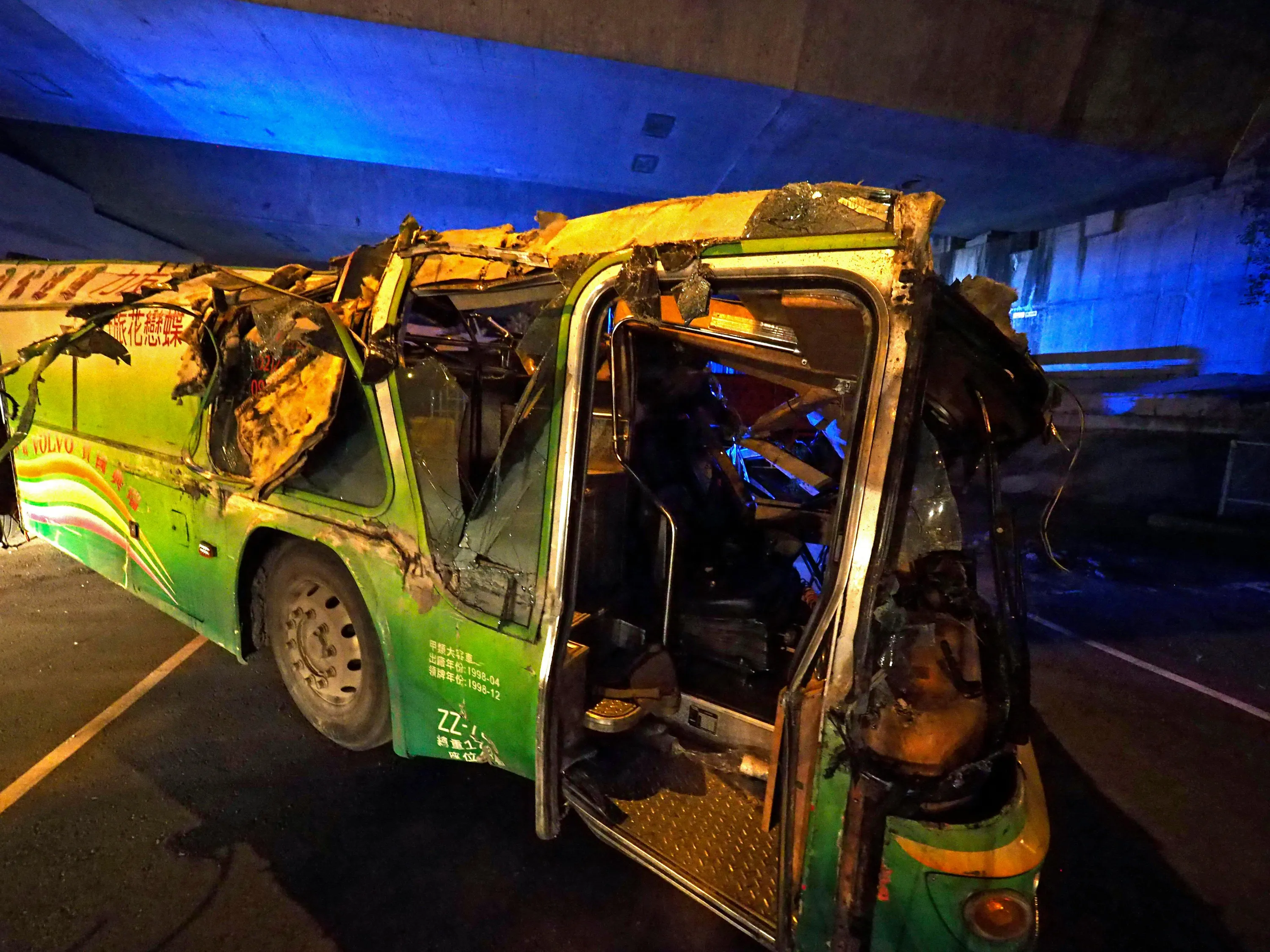 The wreckage of the tourist coach which crashed near Taipei, Taiwan, early 14 February 2017. A tourist coach carrying about 44 people crashed off a highway near Taipei on 13 February, leaving at least 32 dead. The coach crashed through the highway railing and flipped over off a slope, according to media reports. The tourists were on their way home after having visited the Wuling Farm in Taichung County to see cherry blossoms. (Photo by David Chang/EPA)
