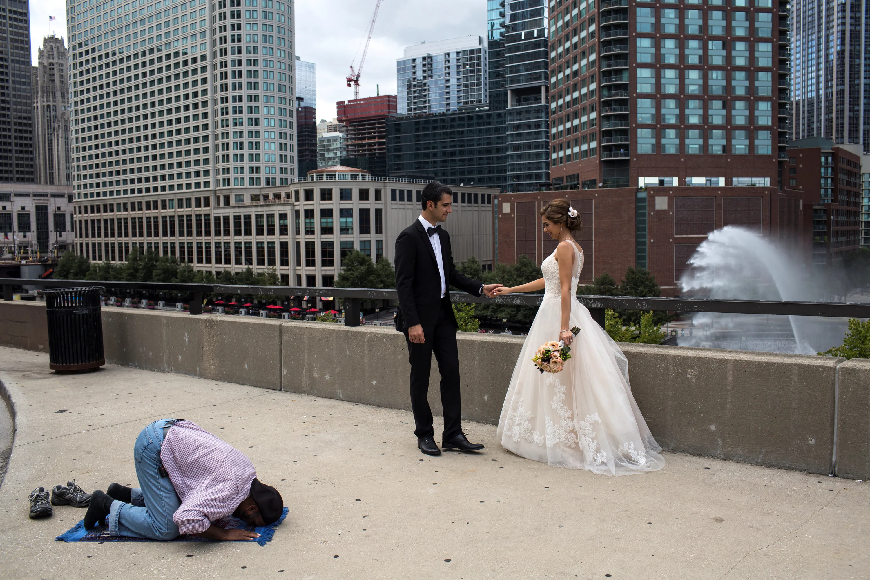 A Muslim taxi driver prays on the sidewalk while Tara and Soroush, two Iranian students who live downtown, celebrate their wedding day in Tehran, Iran. (Photo by Hossein Fatemi/Reuters/Panos Pictures/Courtesy of World Press Photo Foundation)