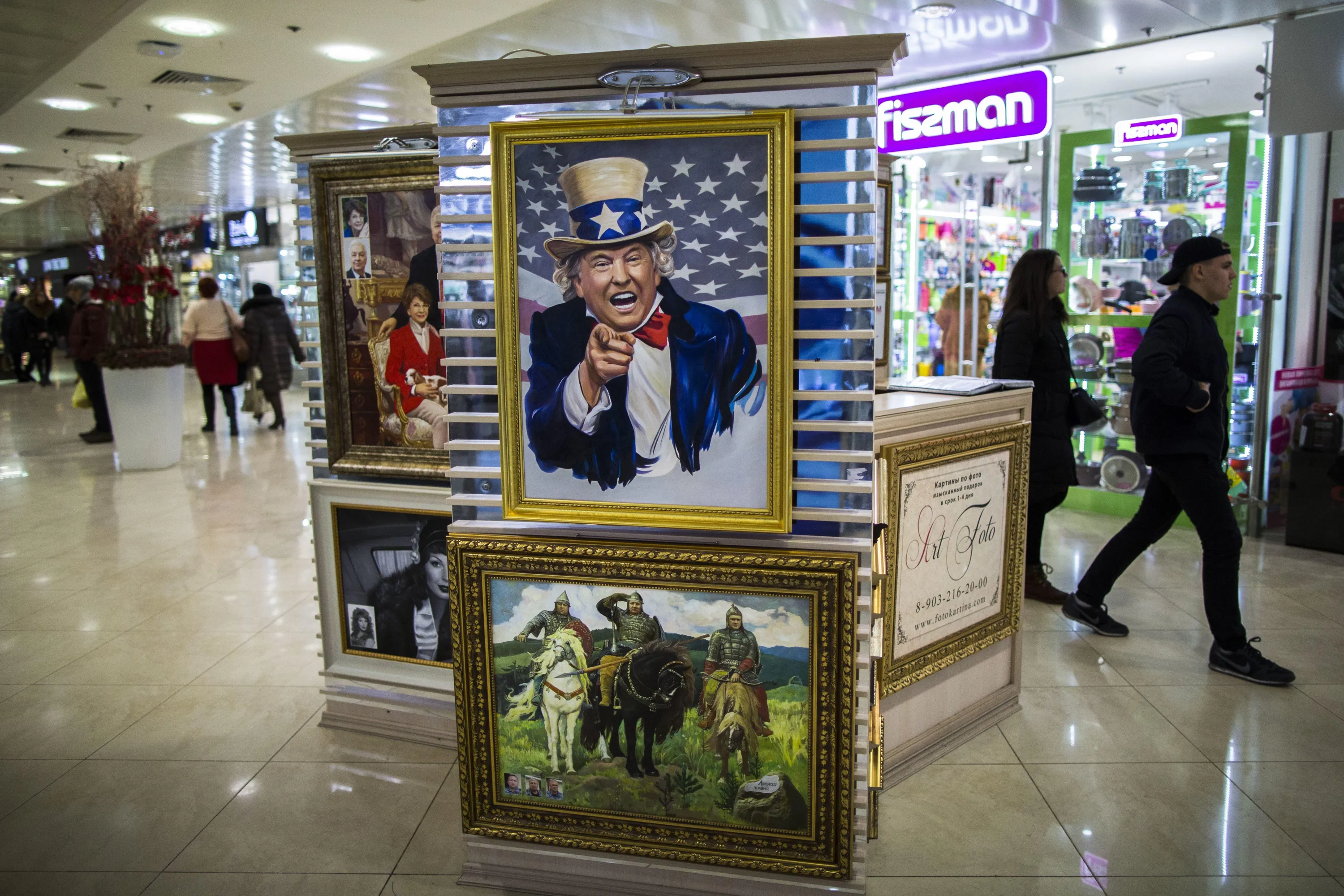 A caricature picture showing U.S. President Donald Trump on sale in a shopping mall in Moscow, Russia, Wednesday, February 15, 2017. The picture costs 70,000 rubles (about $1,200). As President Donald Trump has become increasingly mired in internal political battles, the Kremlin is patiently waiting for him to deliver on his promises to mend ties with Russia weighing its statements to avoid jeopardizing a chance for a thaw. (Photo by Alexander Zemlianichenko/AP Photo)