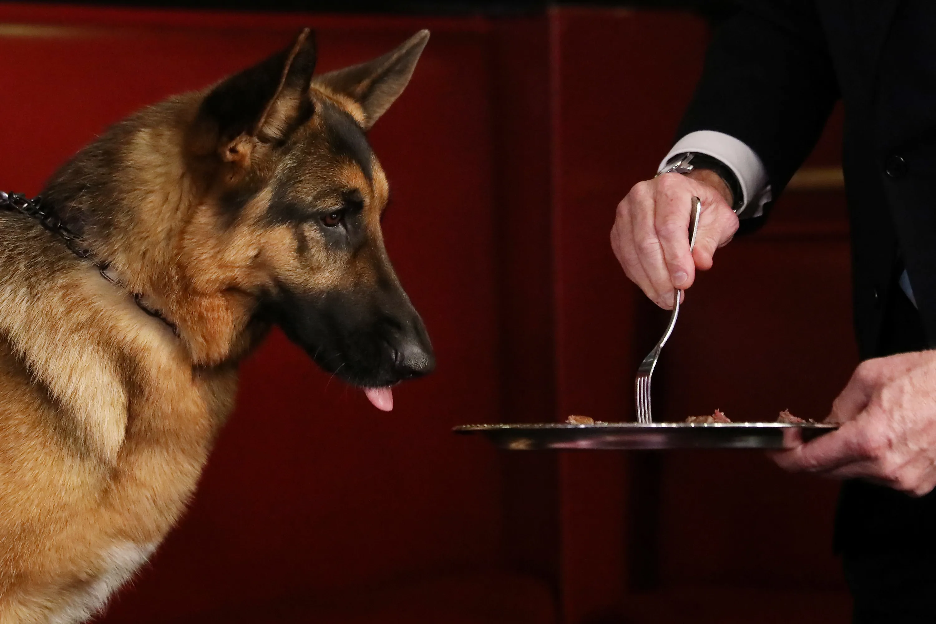 Rumor, a German shepherd and winner of Best In Show at the 141st Westminster Kennel Club Dog Show, is fed steak at Sardi's in New York, U.S., February 15, 2017. (Photo by Shannon Stapleton/Reuters)