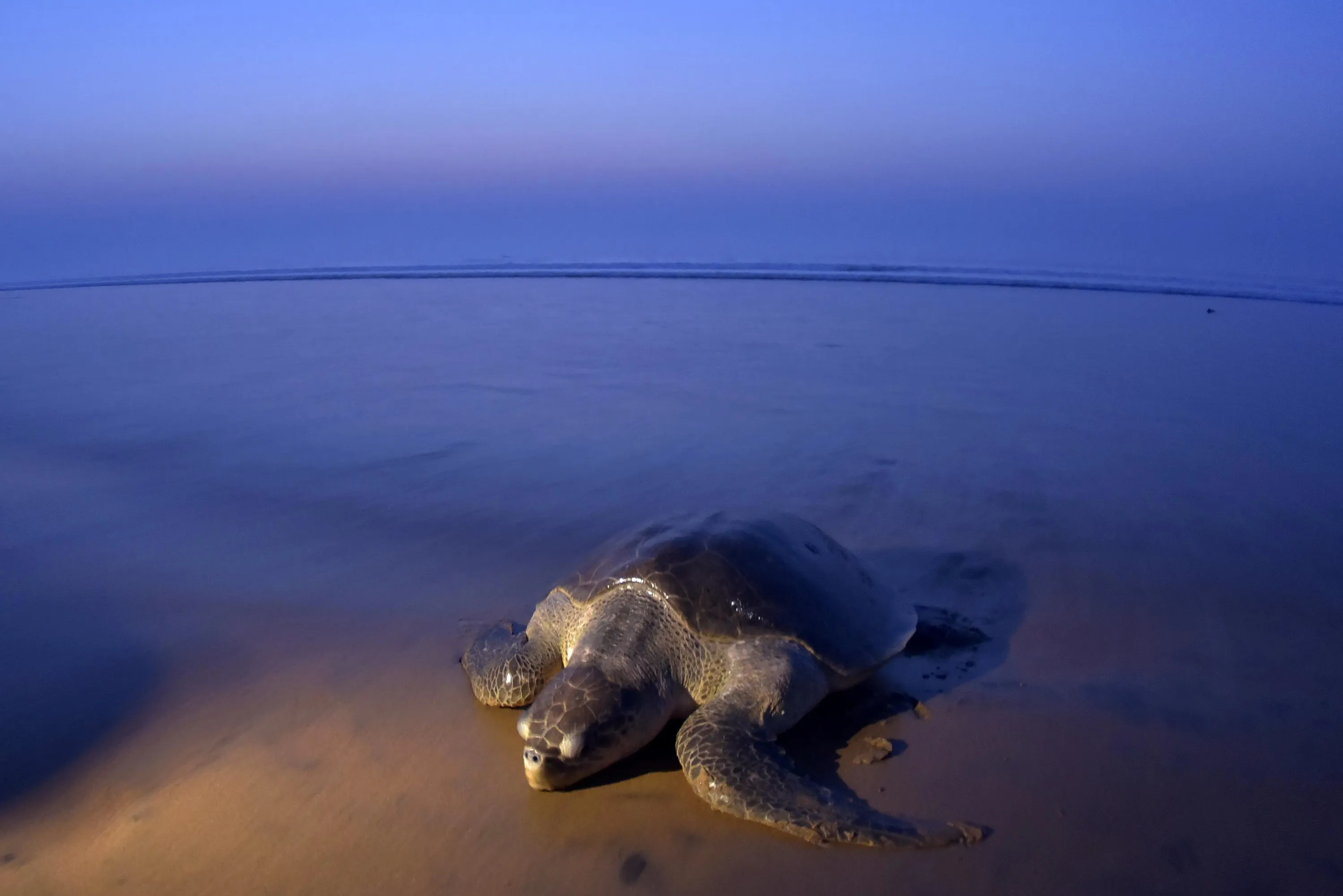 An Olive Ridley Turtle (Lepidochelys olivacea) arrives to lay her eggs on the sand at Rushikulya Beach, some 140 kilometres (88 miles) south-west of Bhubaneswar, early February 16, 2017. (Photo by Asit Kumar/AFP Photo)