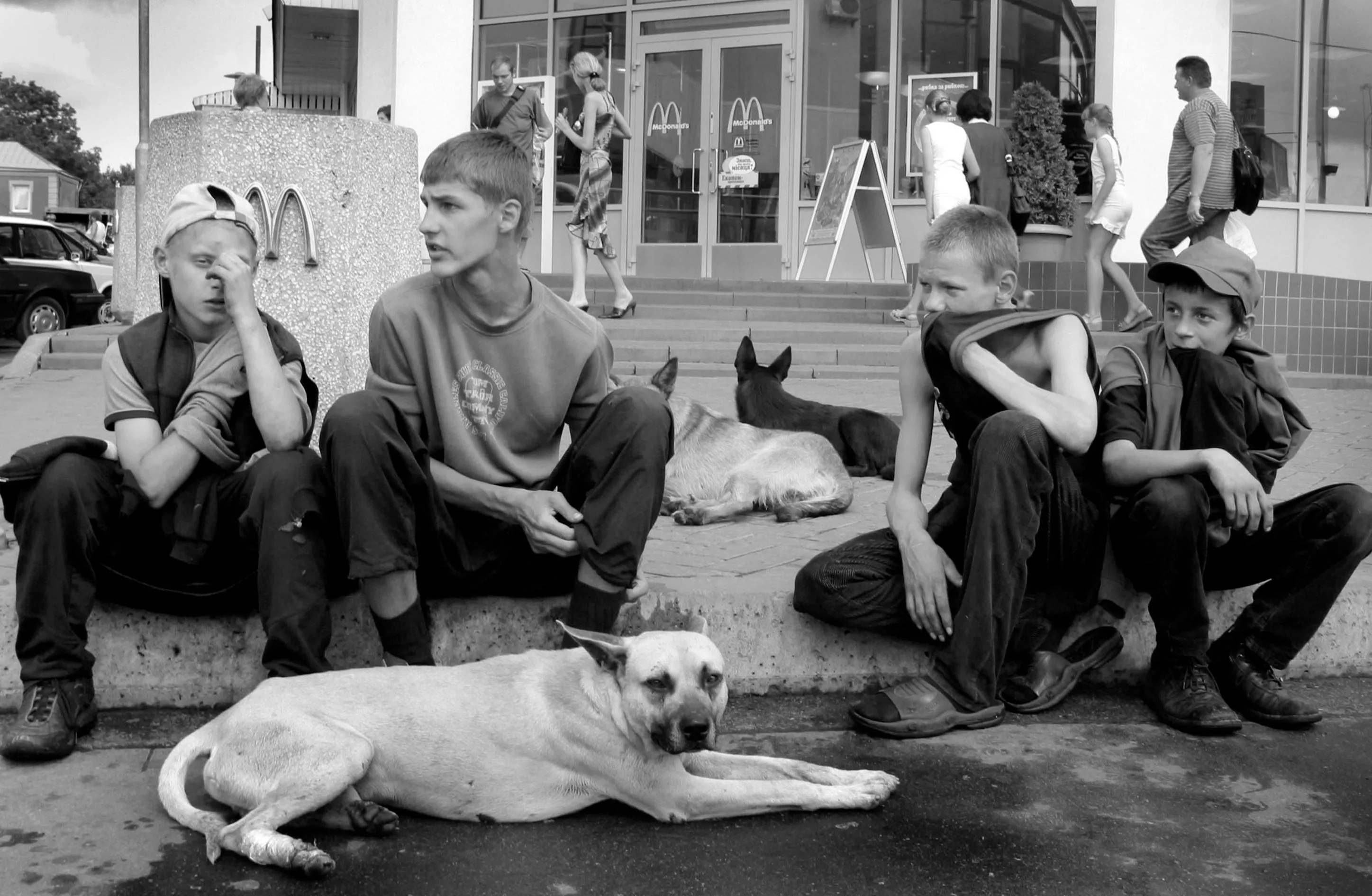 The kids wait at McDonalds for any food that can be scrounged from the trash or from passer-bys, 2003. Few people feel compelled to give these kids any money since they know it will be used for glue, occasionally someone will hand them an unfinished drink or their leftover meals. (Photo by Kurt Vinion /Getty Images)