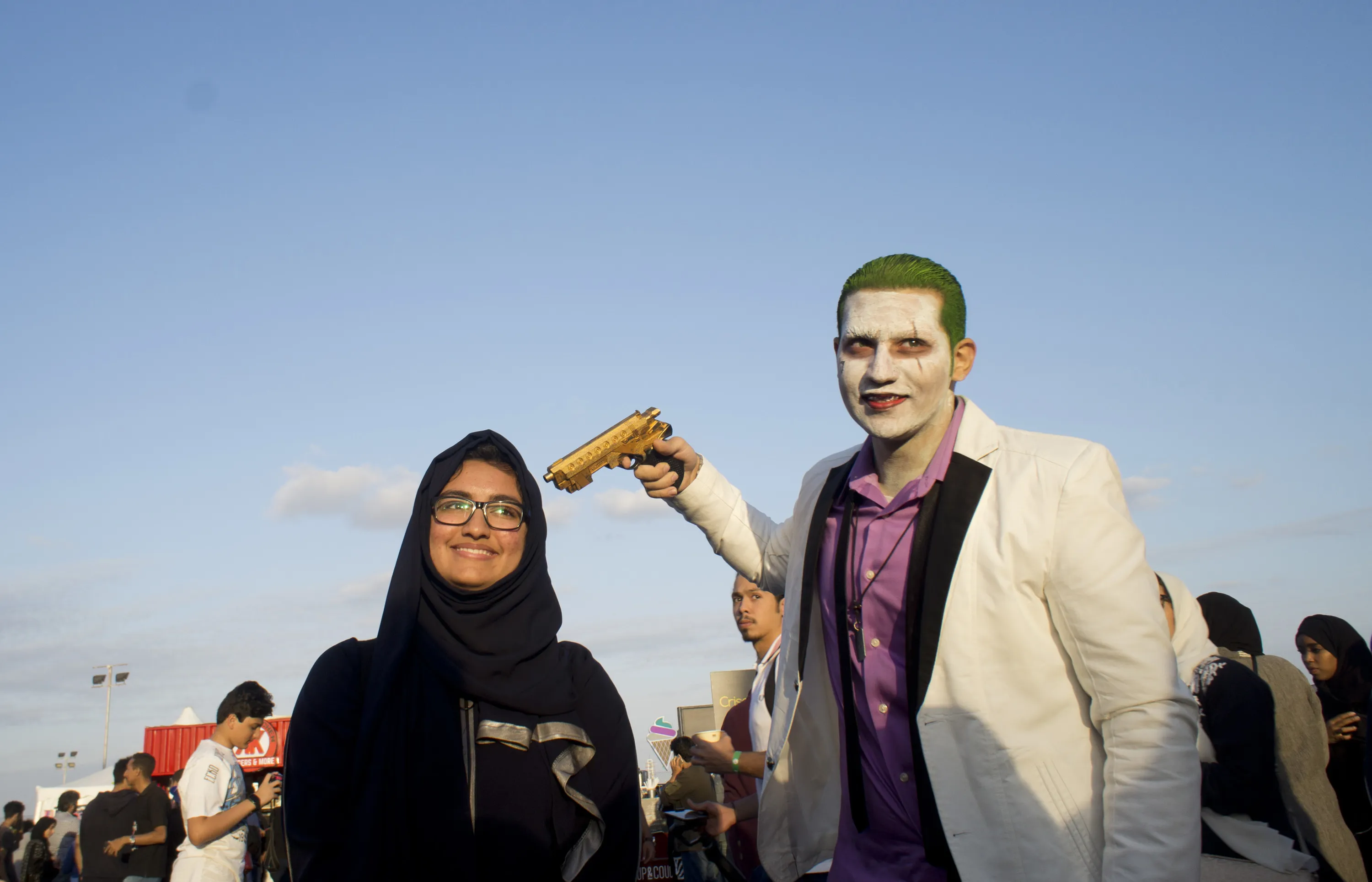 A visitor poses for picture with a man disguised as The Joker, during the Saudi Comic Con (SCC) which is the first event of its kind to be held in Jiddah, Saudi Arabia, Friday, February 17, 2017. (Photo by AP Photo)