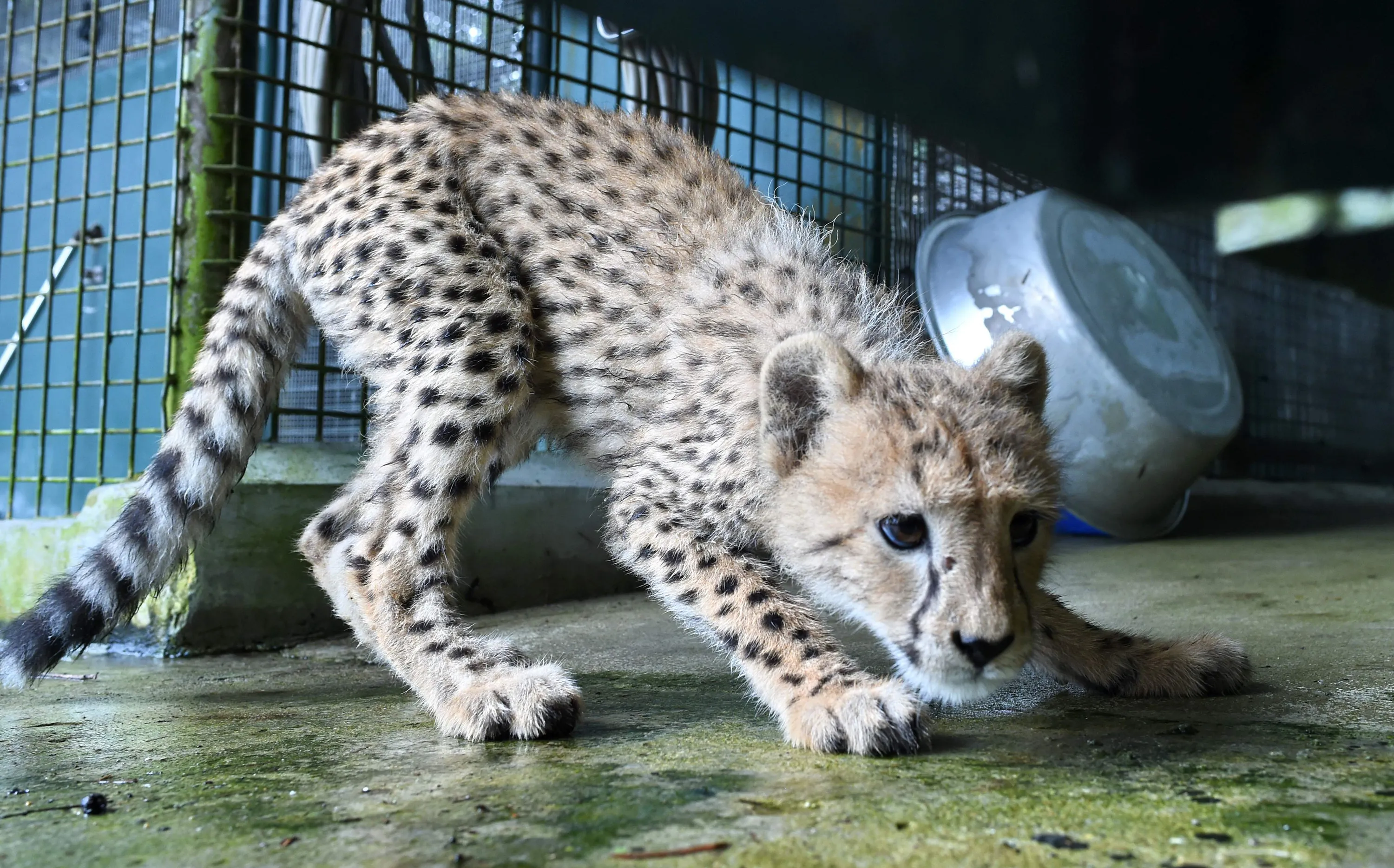 A 4- months old cheetah cub is seen in its enclosure at Wildlife Reserves Singapore zoo on February 15, 2017. Jurong Bird Park, Night Safari, River Safari and Singapore Zoo have reported over 600 animal births and hatchings in 2016, and among them are highly threatened Southeast Asian animals. (Photo by Roslan Rahman/AFP Photo)