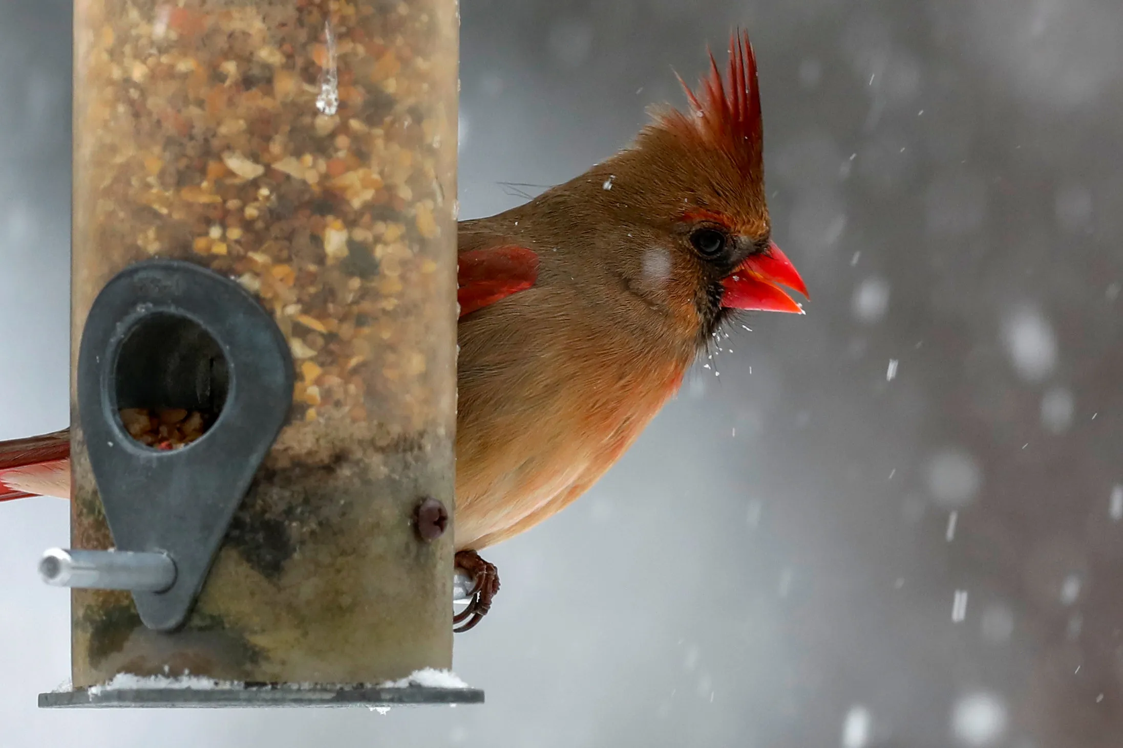 A female Northern Cardinal sits on a bird feeder in falling snow in the Village of Valley Cottage, New York, a suburb north of New York City, U.S. February 12, 2017. (Photo by Mike Segar/Reuters)