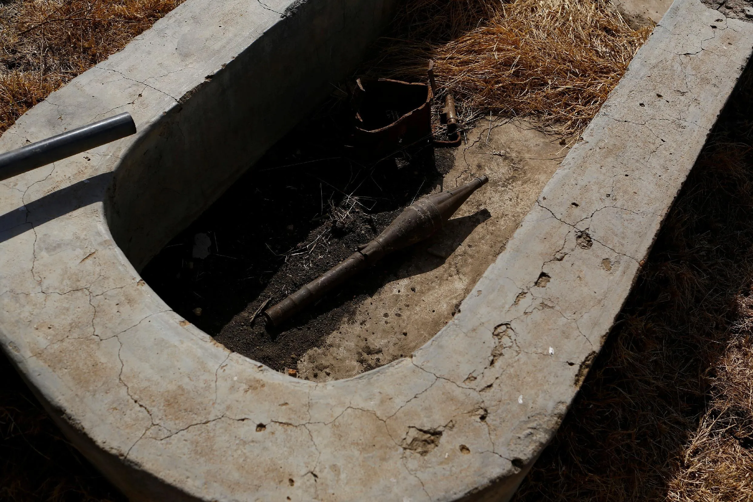 An unexploded rocket propelled grenade lies inside a cement water catchment in the village of Nialdhiu, northern South Sudan, February 7, 2017. (Photo by Siegfried Modola/Reuters)