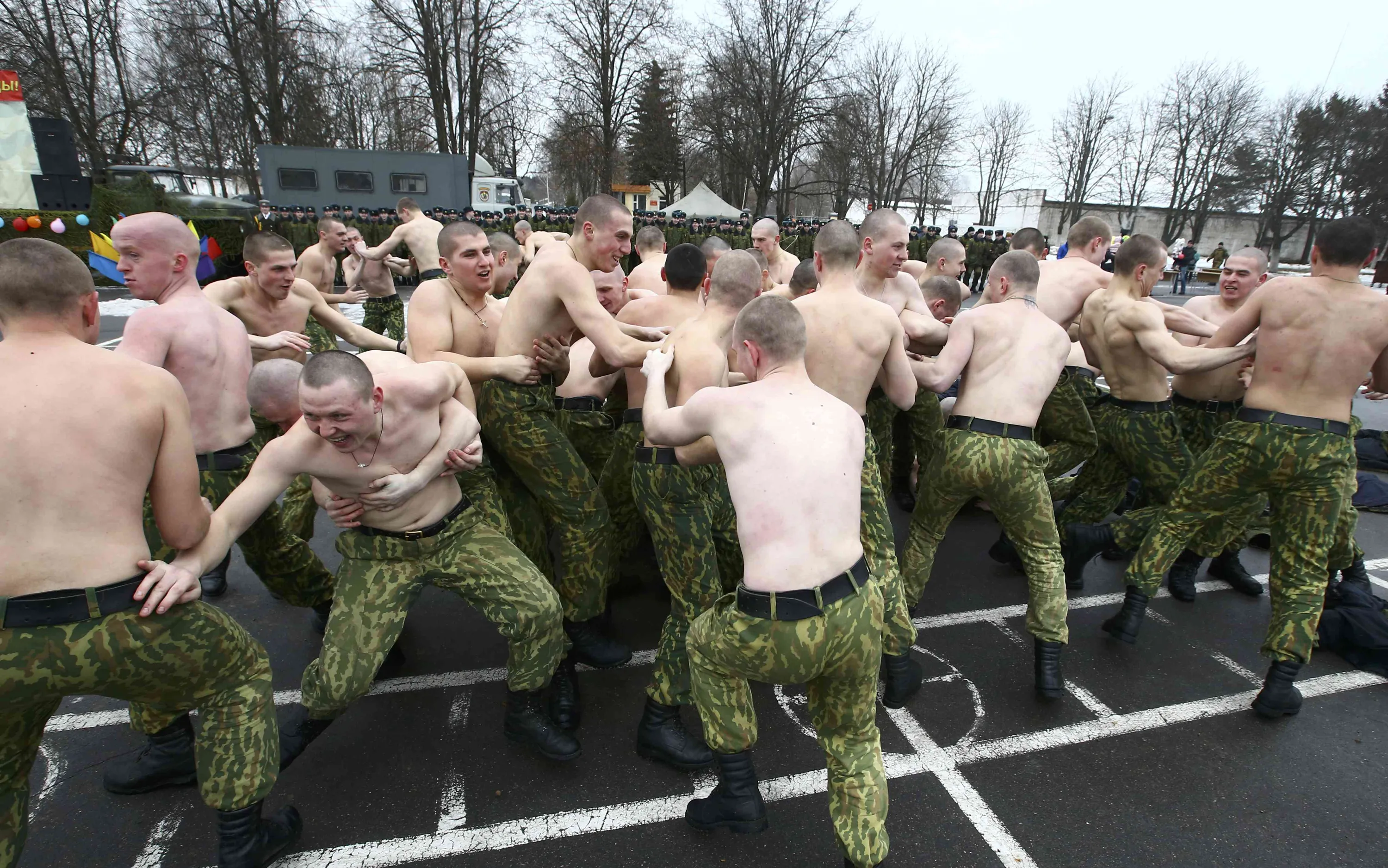 Servicemen of the Belarussian Interior Ministry's special forces unit charge at each other during a traditional fighting game to celebrate Maslenitsa, a pagan holiday marking the end of winter celebrated with pancake eating and shows of strength, at their base in Minsk, Belarus February 19, 2017. (Photo by Vasily Fedosenko/Reuters)