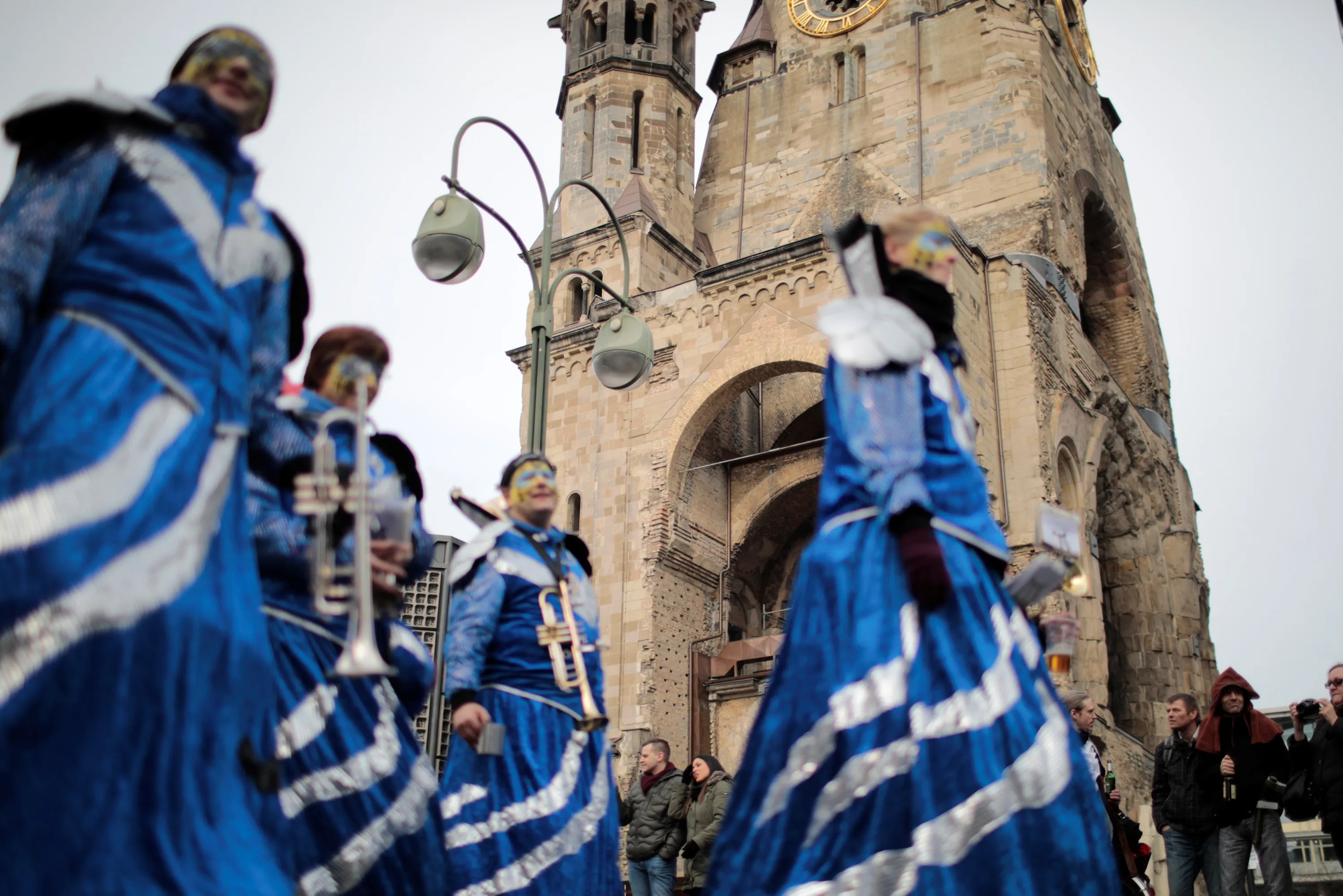 A carnival group takes part in a moment of silence as they walk past the Breitscheidplatz, the site of a Christmas market where a truck ploughed through a crowd last December, in Berlin, Germany February 19, 2017. (Photo by Axel Schmidt/Reuters)