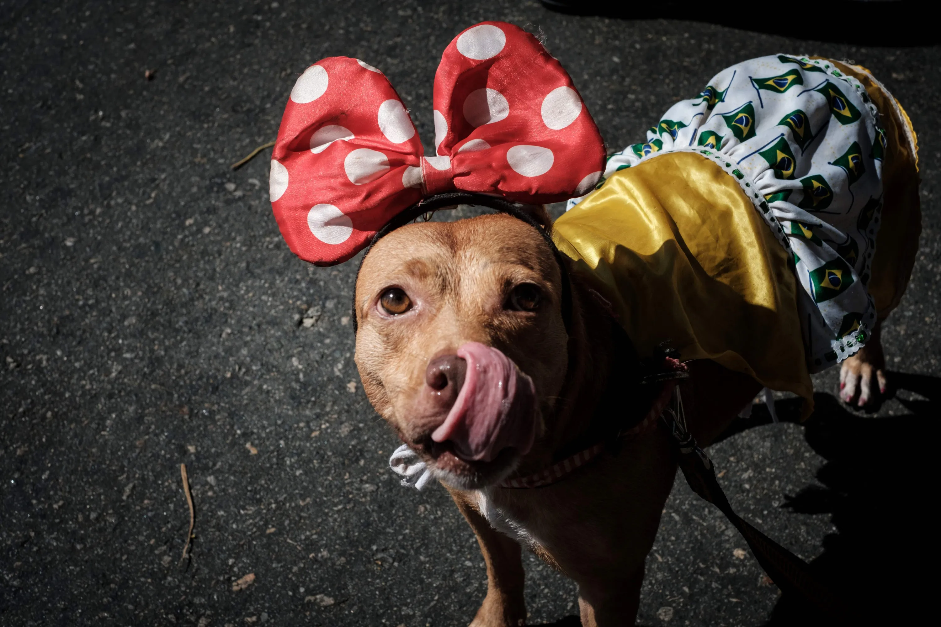 A dog dressed in costume is seenduring the Rio Dog Carnival, known as the Blocao – with “bloco” meaning street party and “cao” dog, during pre- carnival celebrations at Copacabana beach in Rio de Janeiro, Brazil, on February 19, 2017. (Photo by Yasuyoshi Chiba/AFP Photo)