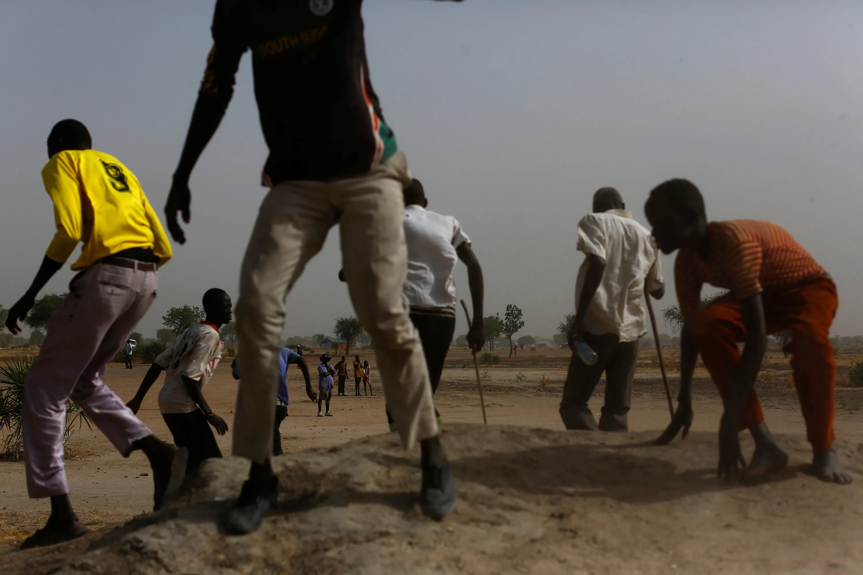 People move away from as a United Nations World Food Programme (WFP) helicopter lands in Rubkuai village, Unity State, northern South Sudan, February 17, 2017. (Photo by Siegfried Modola/Reuters)