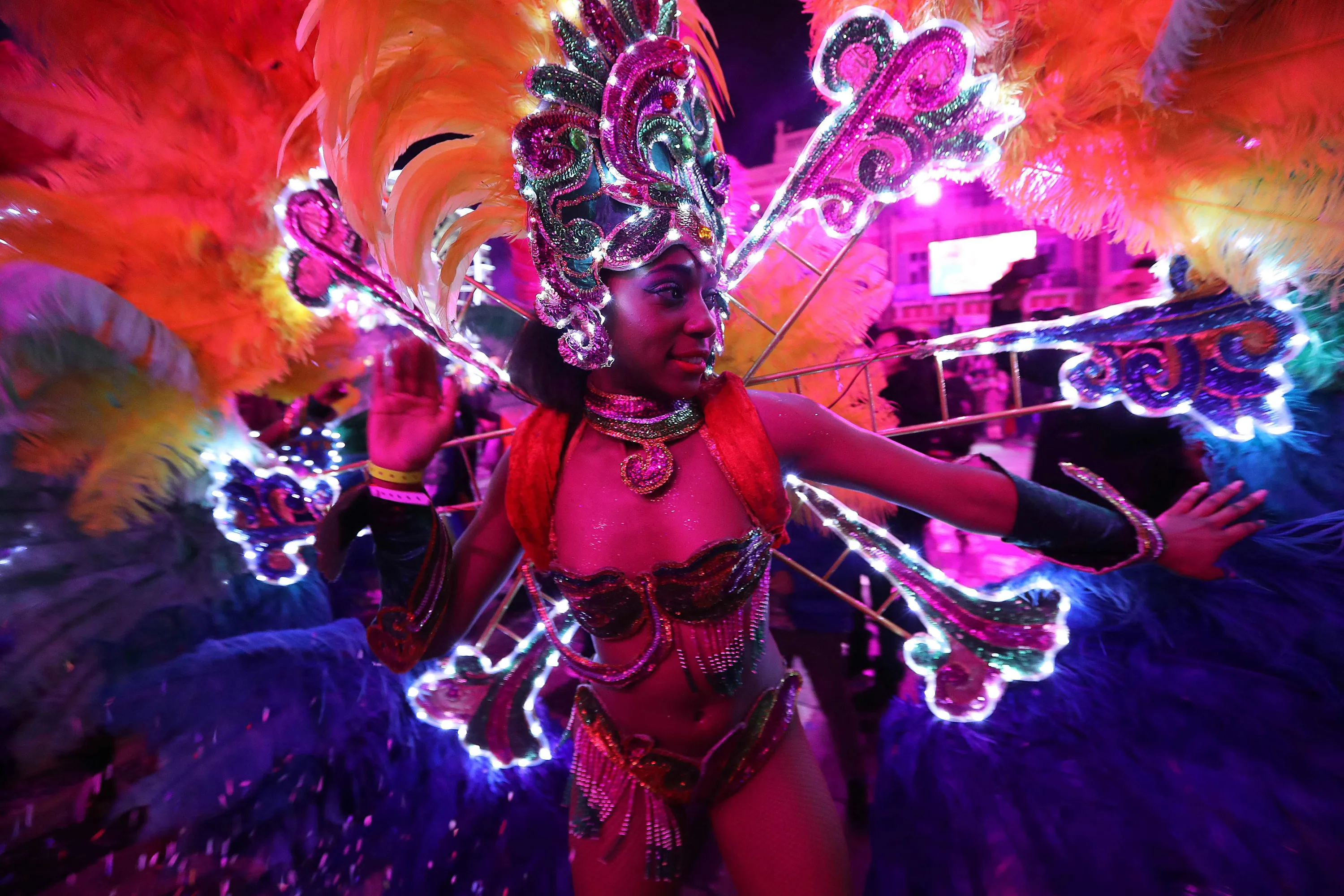 A dancer performs during the 133 rd edition of the Nice Carnival in Nice, southeastern France, on February 21, 2017. (Photo by Valery Hache/AFP Photo)