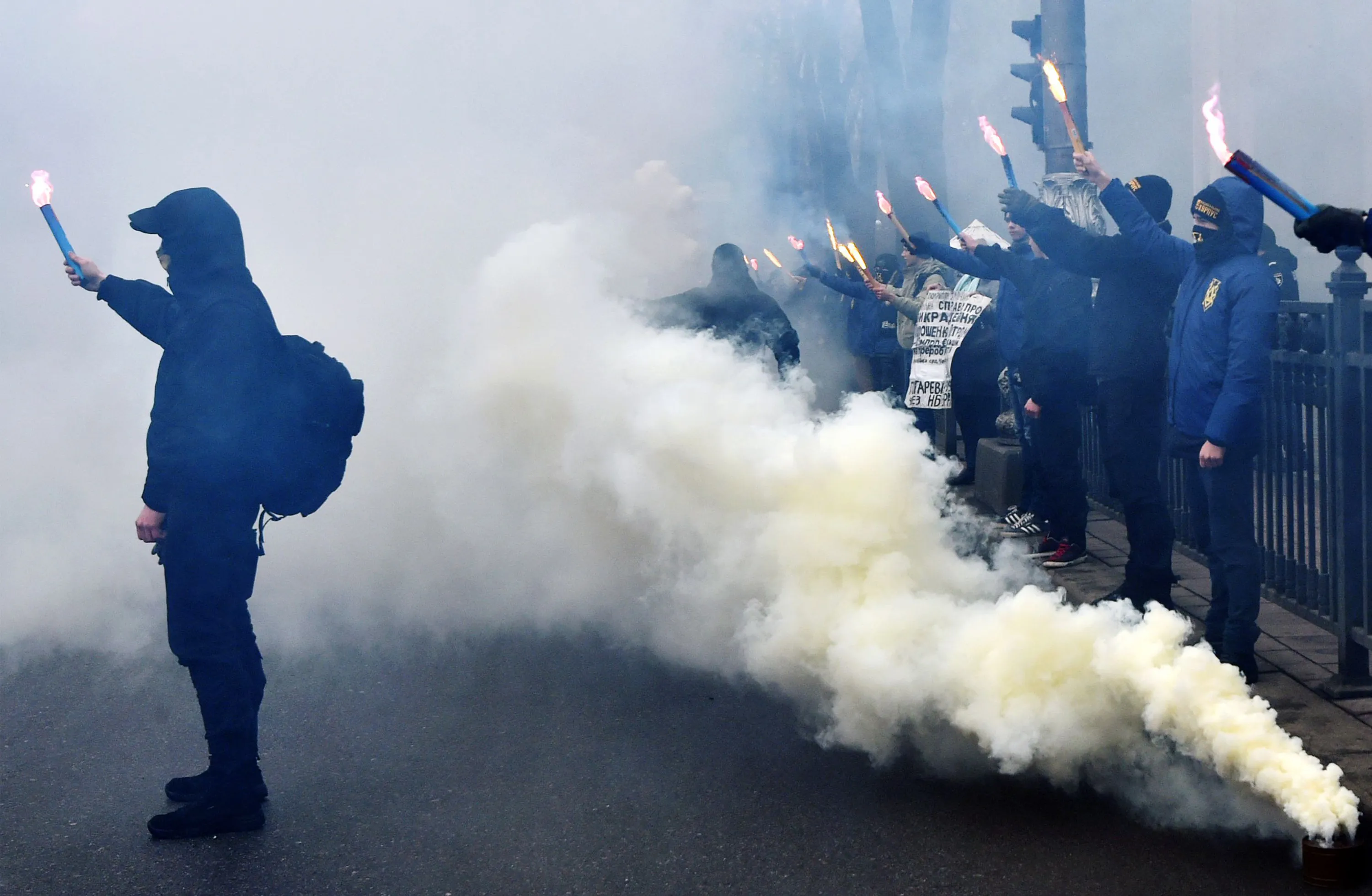 Supporters of various Ukrainian nationalist parties light smoke bombs as they chant slogans during a rally in front of Ukrainian Parliament, in central Kiev, on February 22, 2017. Members and supporters of ultra-nationalists “Svoboda”, “Pravy Sektor” and “National Corpus” political parties gathered on February 22, 2017 to mark the third anniversary of pro-EU protests that toppled pro-Kremlin president Viktor Yanukovych that was followed by Moscow's annexation of the Crimea peninsula and the Russian-backed insurgency in eastern Ukraine. (Photo by Genya Savilov/AFP Photo)